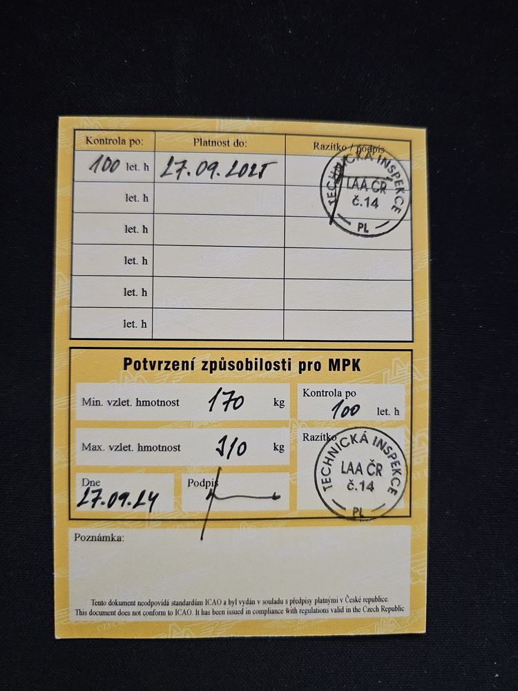 Vlastnosti: Nevětveno, Nelétáno na písku, Na motor, Tandem, Žádné SIV, Nekoupáno