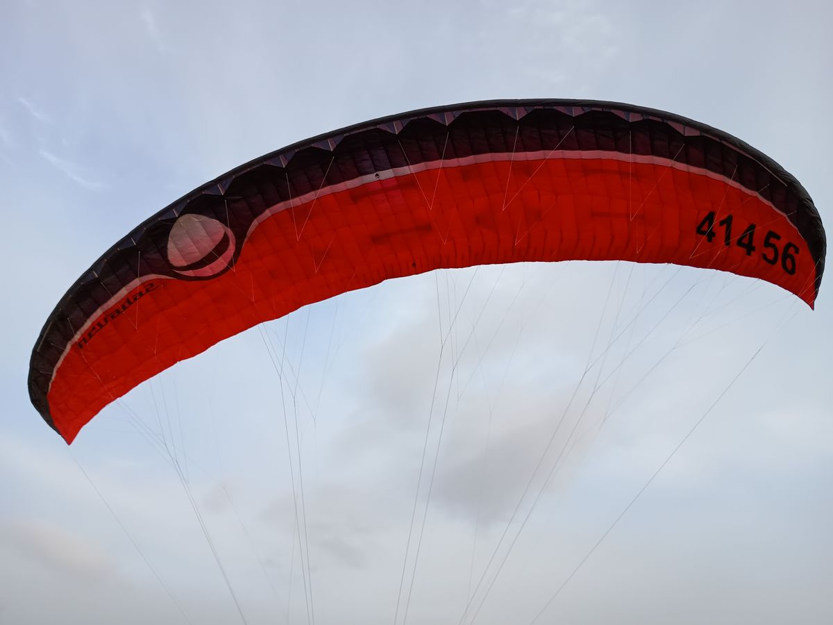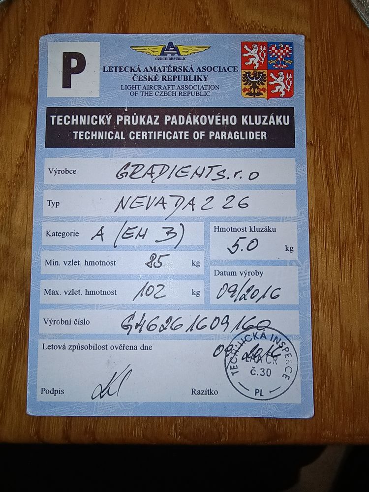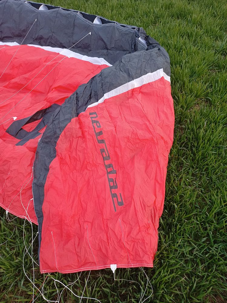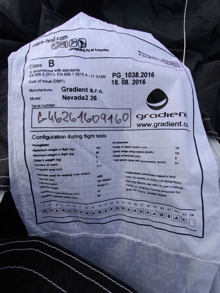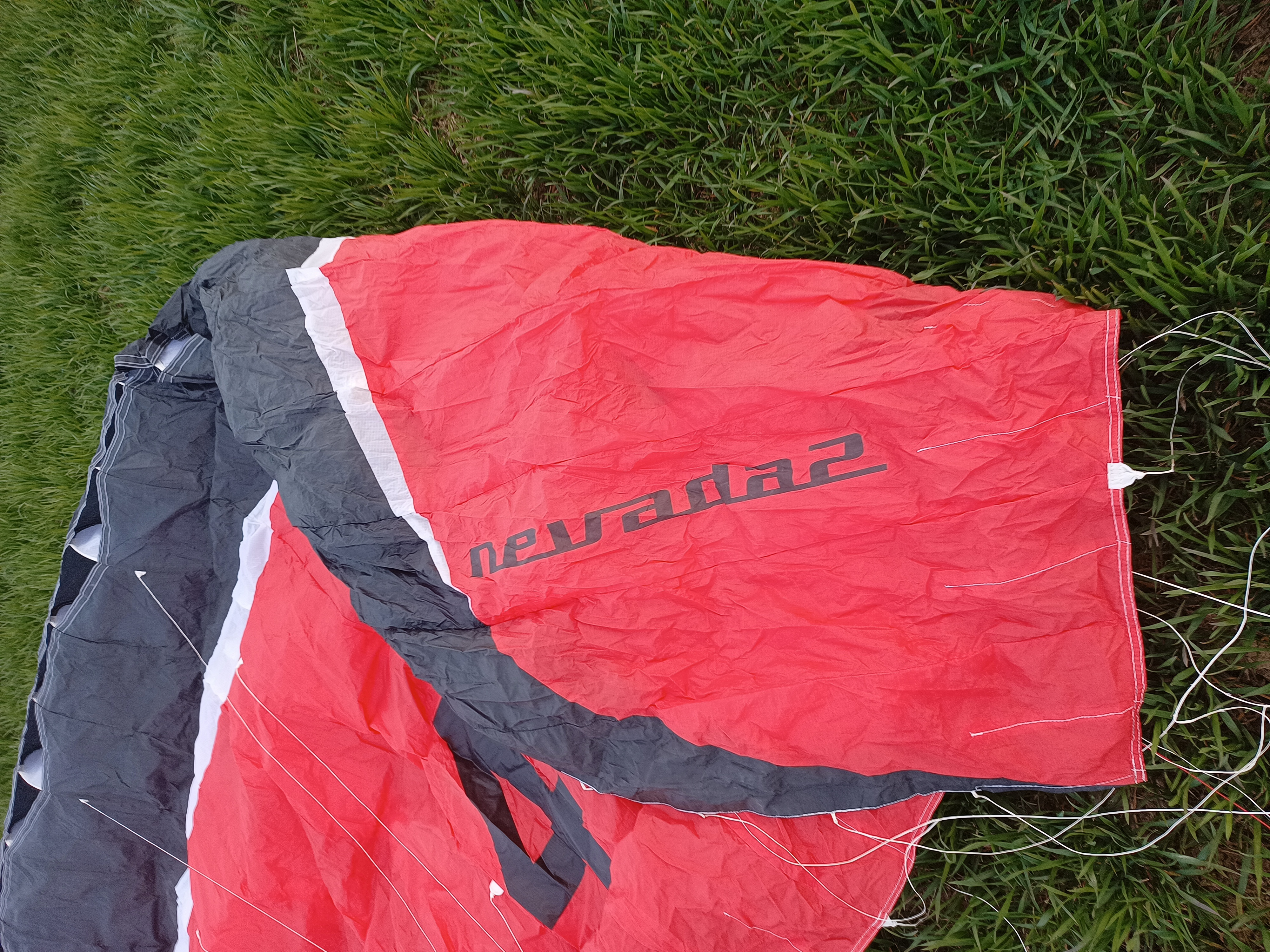 Nevada 2 26 koupená z druhé ruky 2021 ve Švýcarsku. Od té doby létaná minimálně. Horní potah působí zaprášeně-padák byl zřejmě na dovolené u moře. Vnitřní stav přesto "jako nový" (viz foto) bez jakéhokoliv náznaku opotřebení.