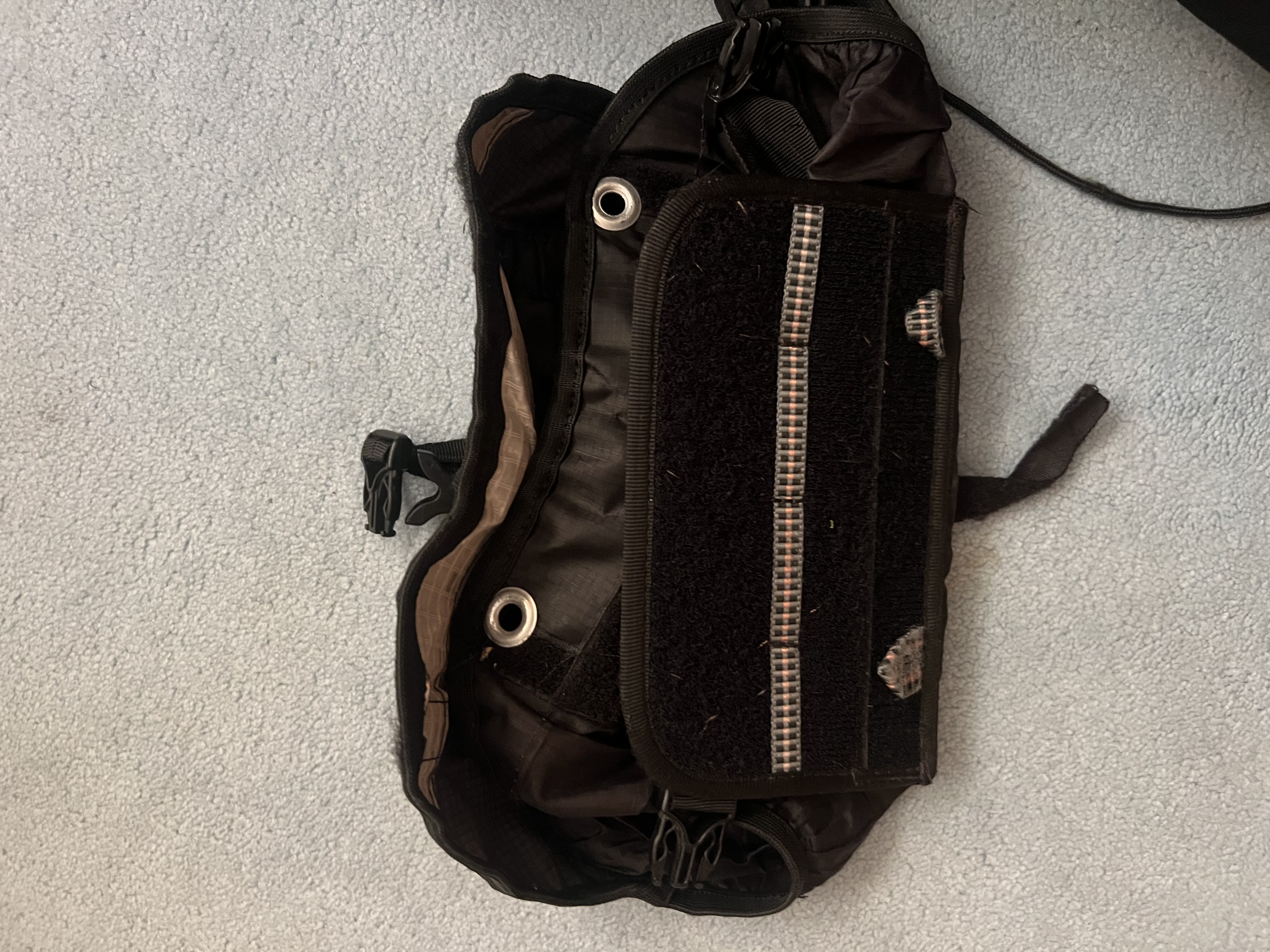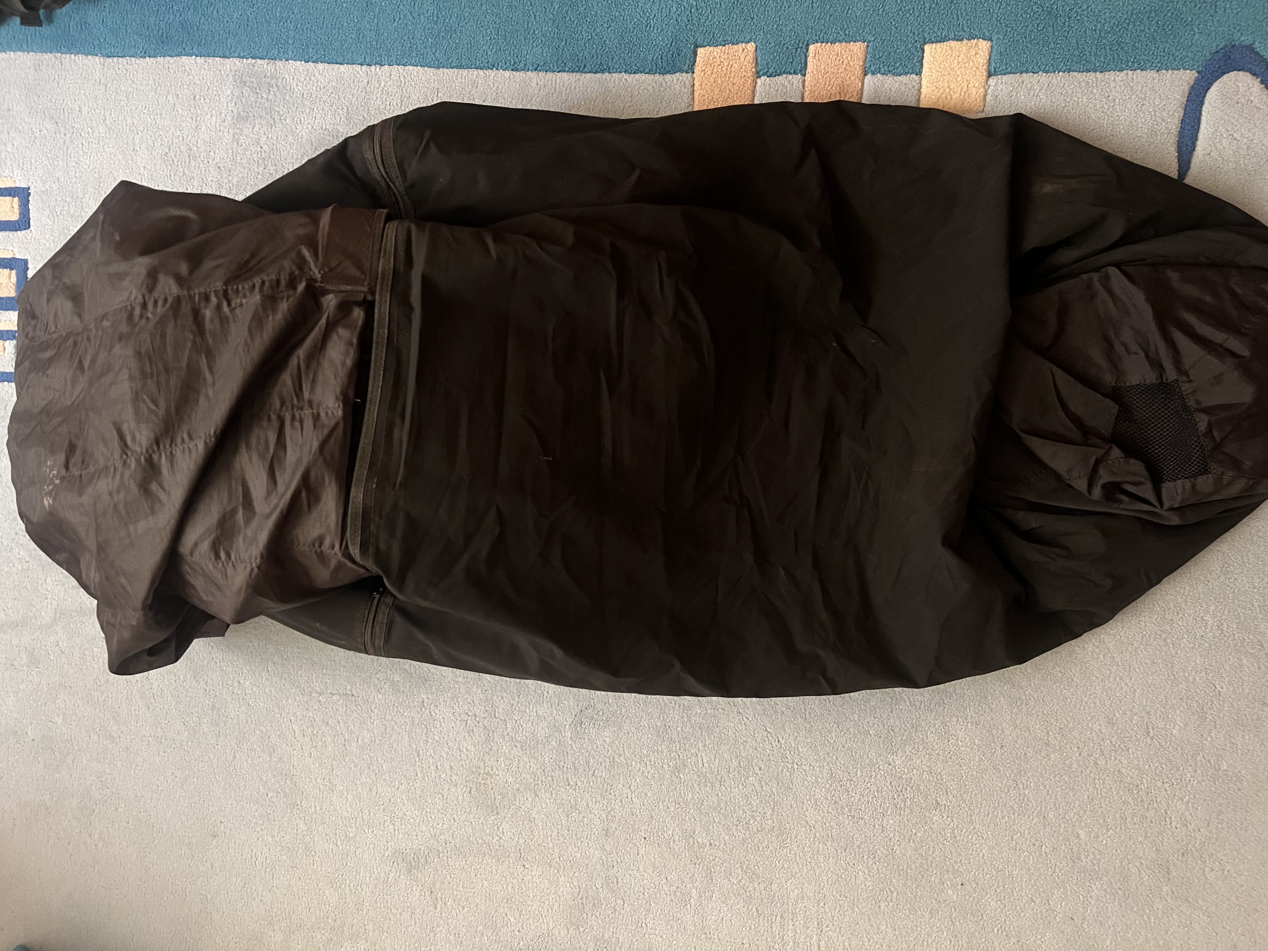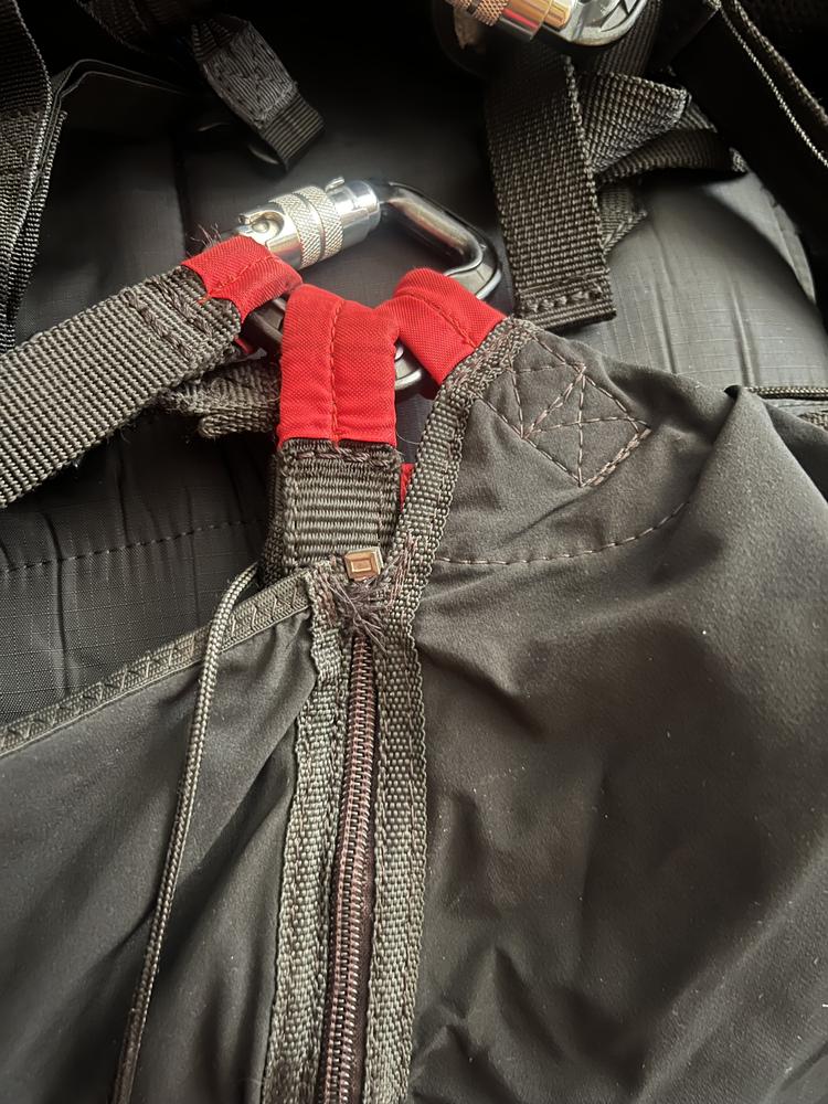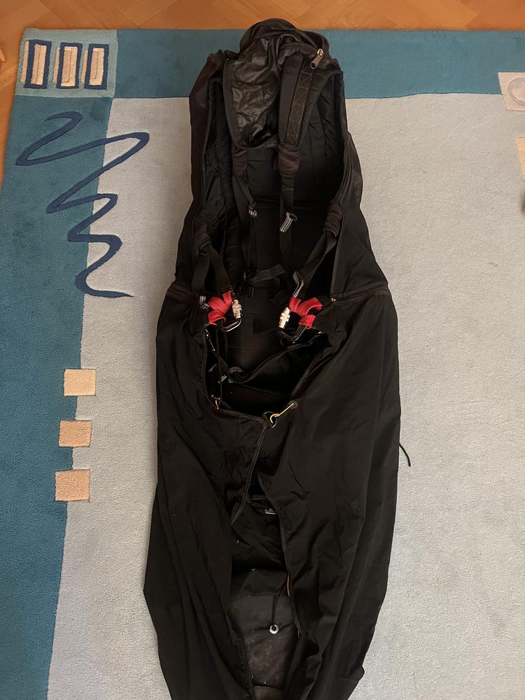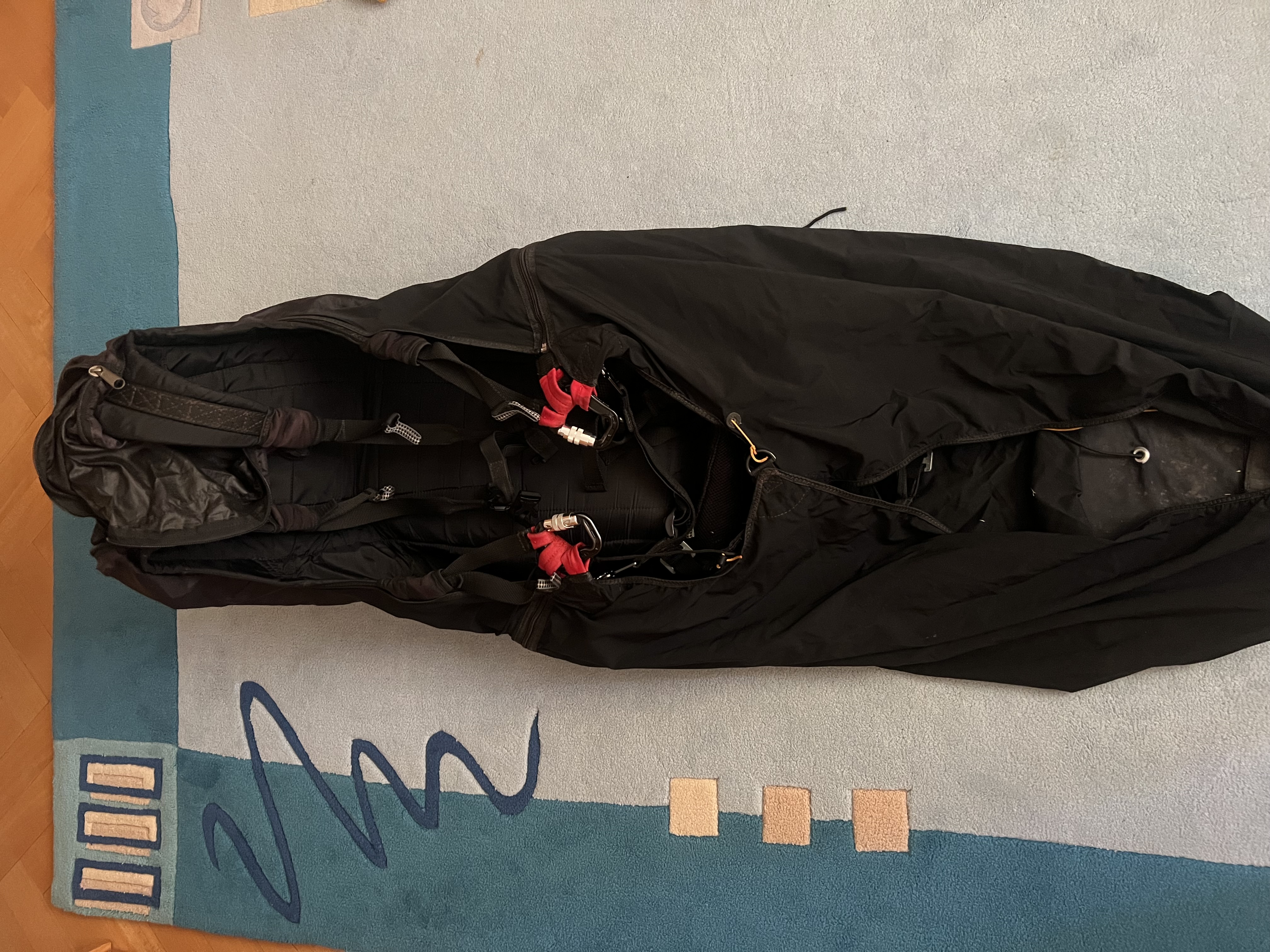 Prodám lehkou sedačku s kokonem. Má něco za sebou (viz. zašitý zip na pravém boku), ale ještě určitě někomu poslouží. Záložní padák v předním kontejneru.