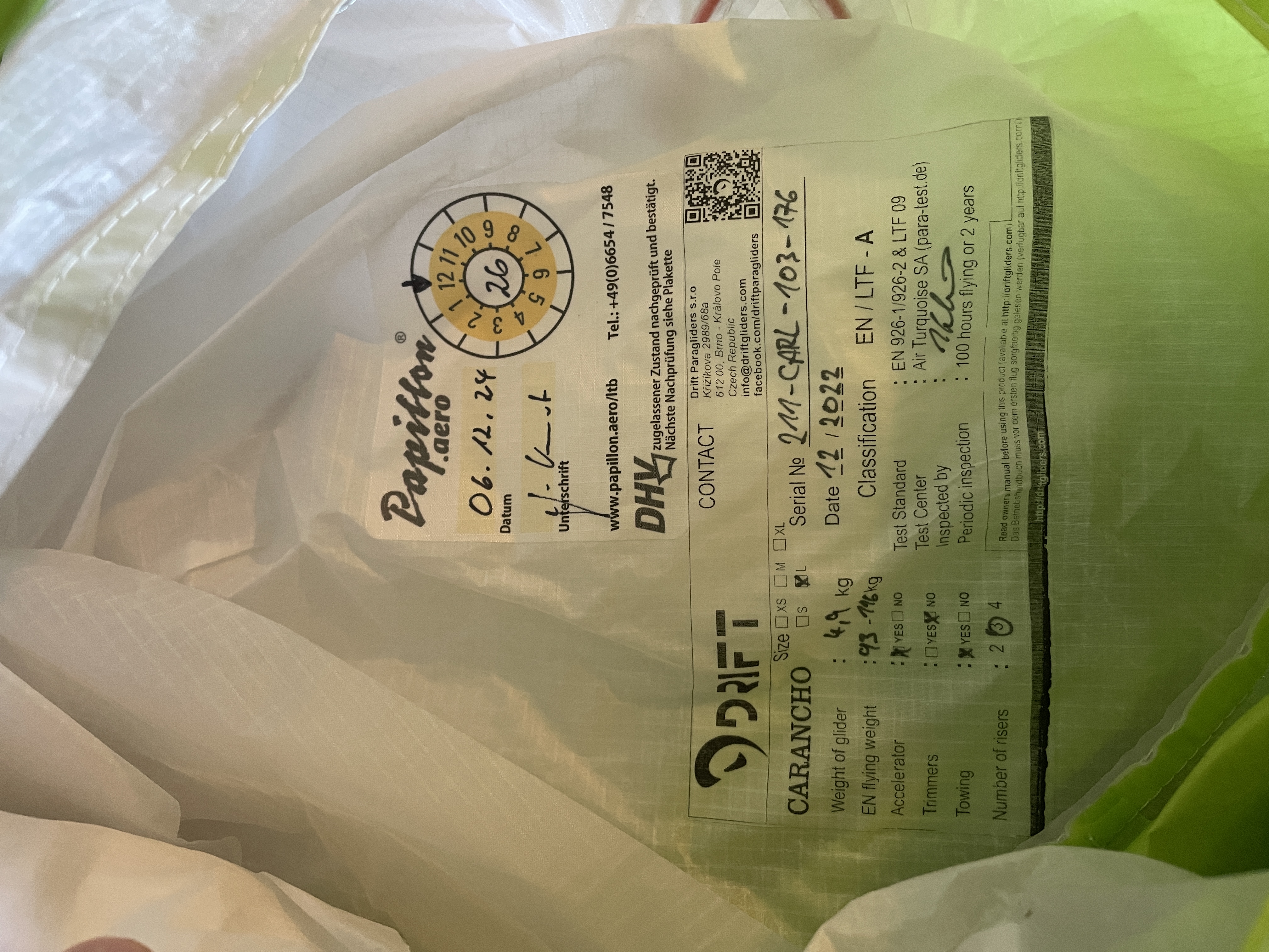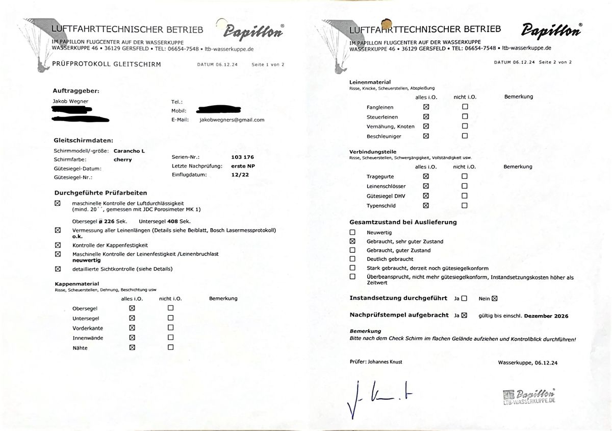 Koupil jsem ho hned po ukončení výcviku ve své paraglidingové škole a odlétal jsem na něm asi 50 startů s celkovým náletem přibližně 20 hodin. Tomu odpovídá i jeho velmi dobrý stav (viz protokol). Vždy mi záleželo na šetrném zacházení s vybavením. Nebyl používán u moře a vždy byl dobře vyvětrán a skladován v suchu. Má platný kontrolní protokol do prosince 2026.