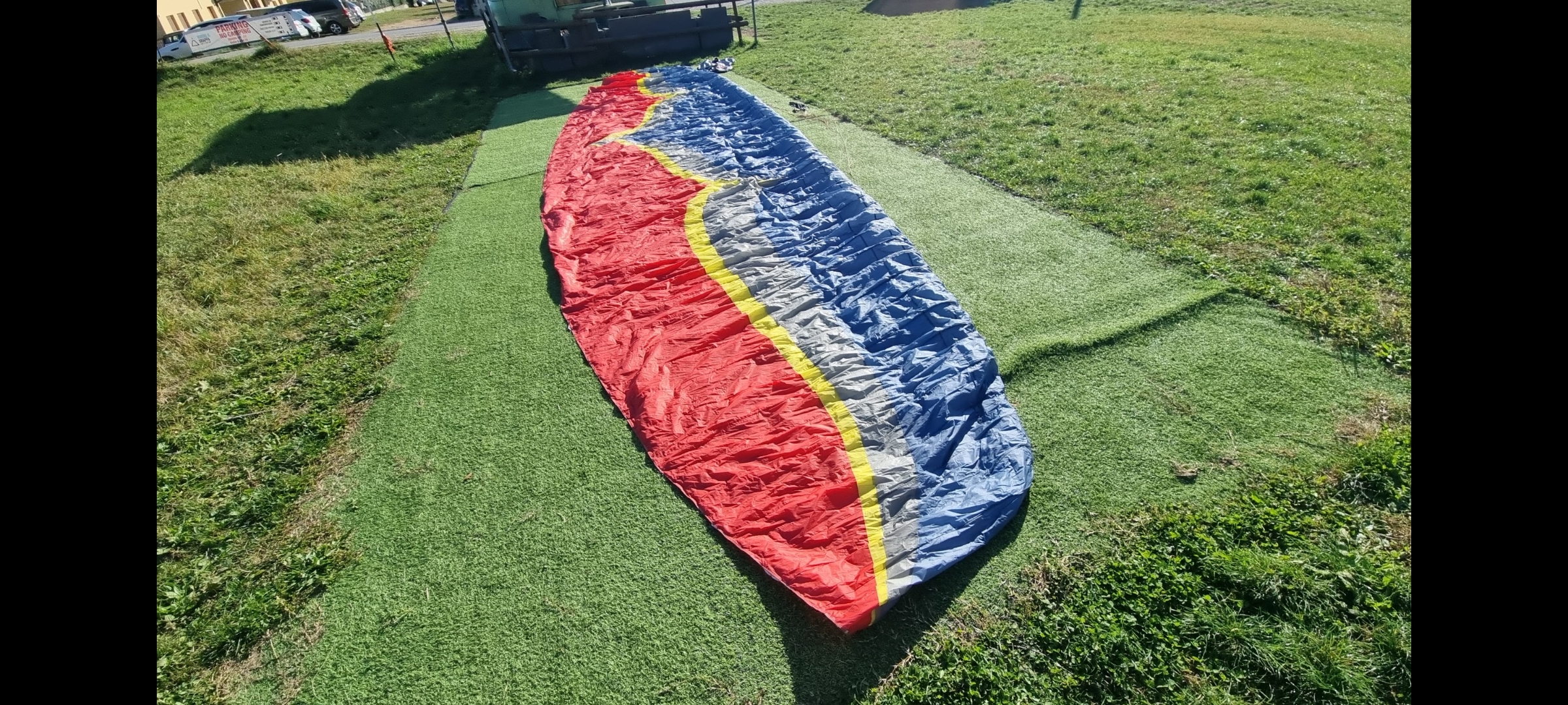 Der Fallschirm ist in einwandfreiem Zustand. Flugzeit: 160 Stunden. Porosität unten: ca. 3000 s, oben: ca. 1000 s. Ein sehr schöner Ceček-Gleitschirm.