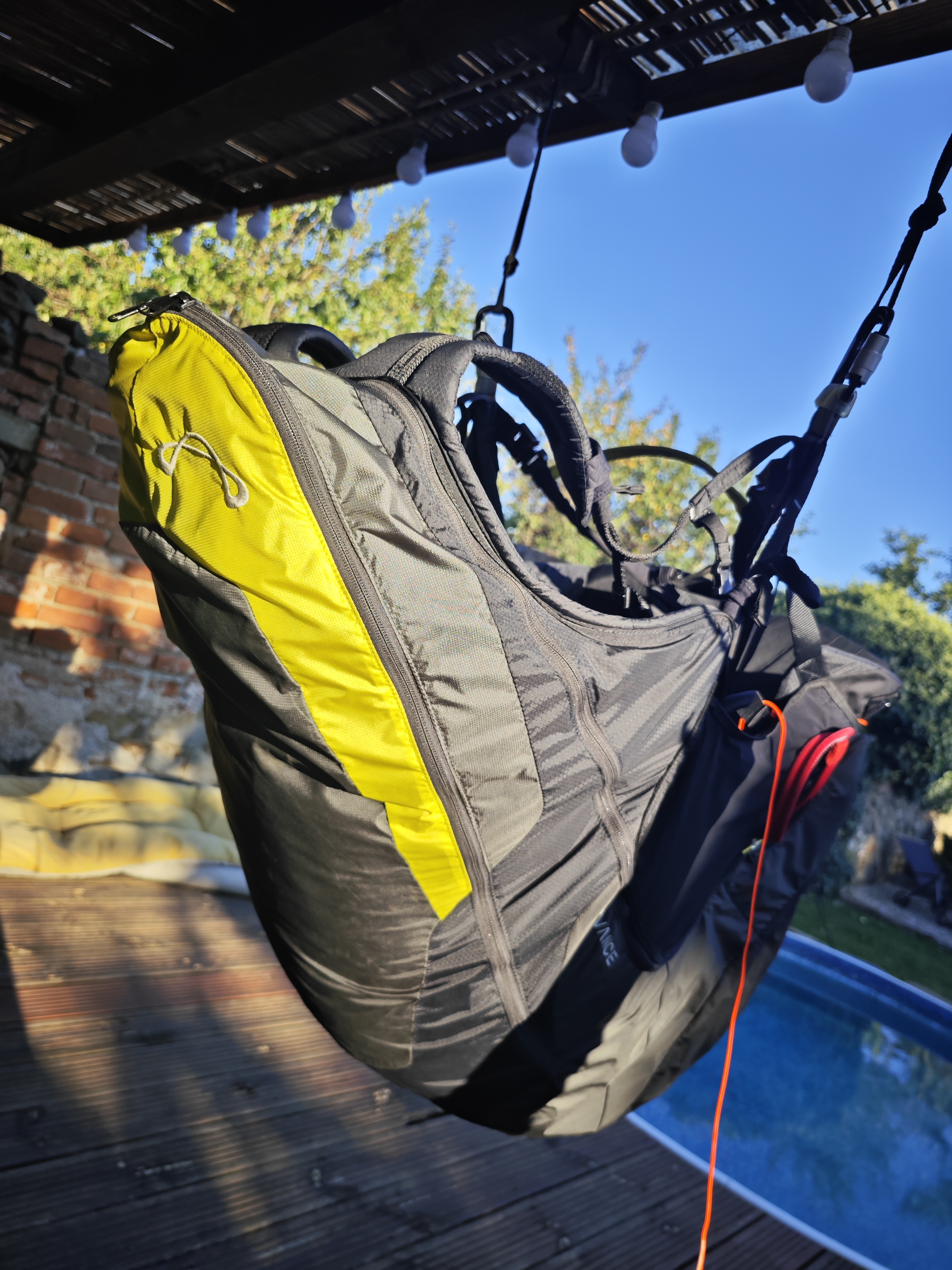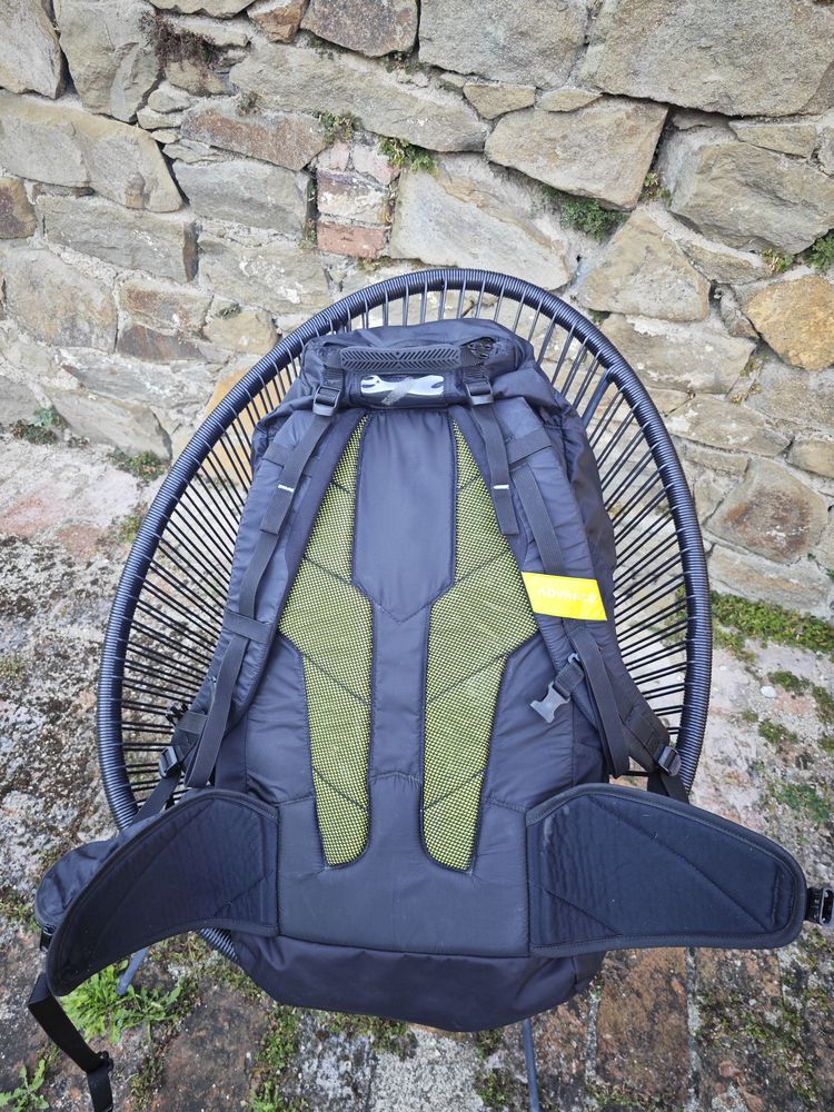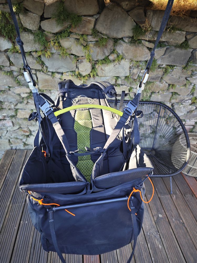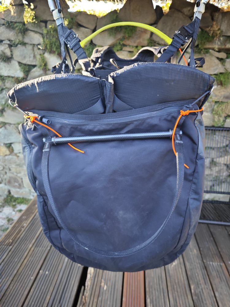 Lightweight reverse seat (backpack and seat in 1) weighing only 3.6 kg. The seat is extremely comfortable, even when walking or hiking (in the form of a backpack it is comparable to a good backpack). It has many different pockets, a helmet net, carbon speed, foam protector. Ideal for beginners or hyke & fly. In good undamaged condition.