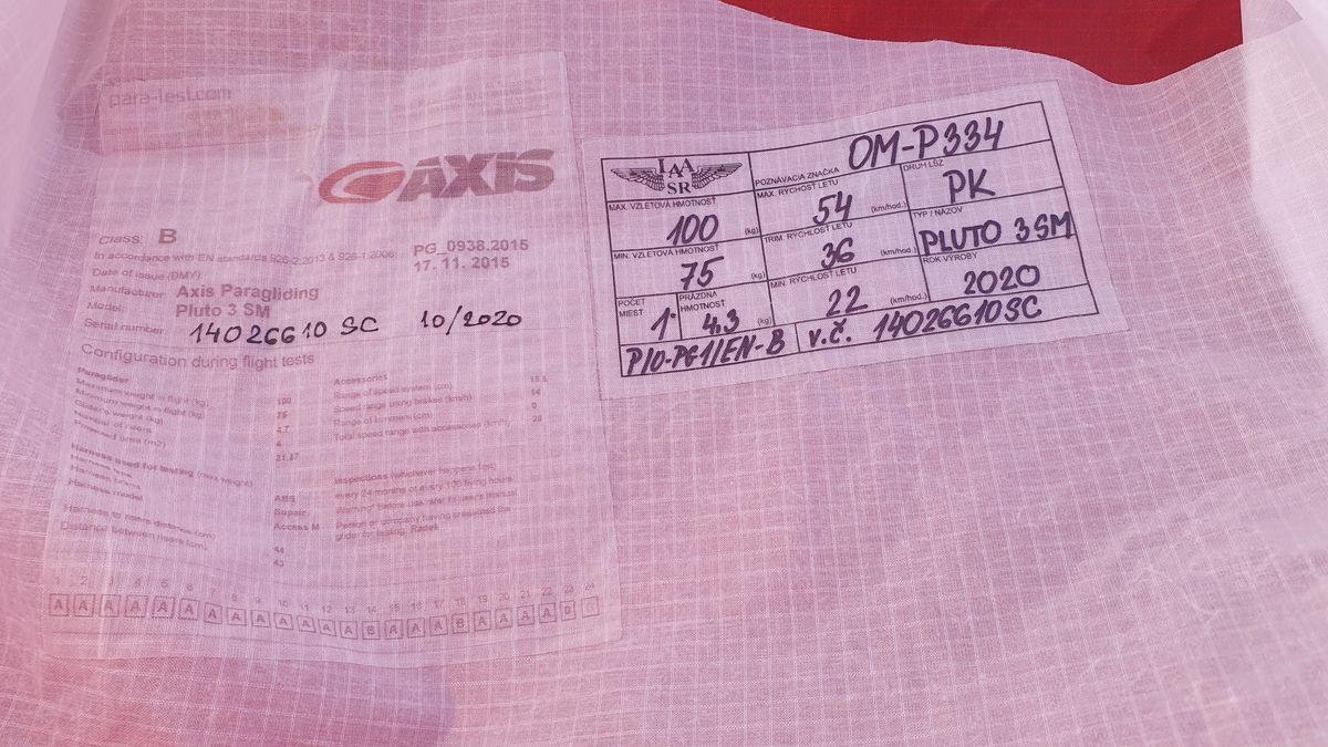 For sale paragliding wing Axis Pluto 3 (10/2020) - size SM I am offering a very well-preserved wing Axis Pluto 3, year of manufacture 10/2020, size SM (pilot 75–100 kg), with trims also for powered paragliding up to 130 kg. The price also includes an older Sky seat Only flown 70 hours No damage Valid technical certificate Registered in the LAA SR The wing falls into the EN-B medium category - very safe and reliable, suitable for both free XC flying and powered paragliding (PPG). An ideal choice for beginners after a course who want to safely develop their skills in PG and PPG. If you are interested, do not hesitate to contact me