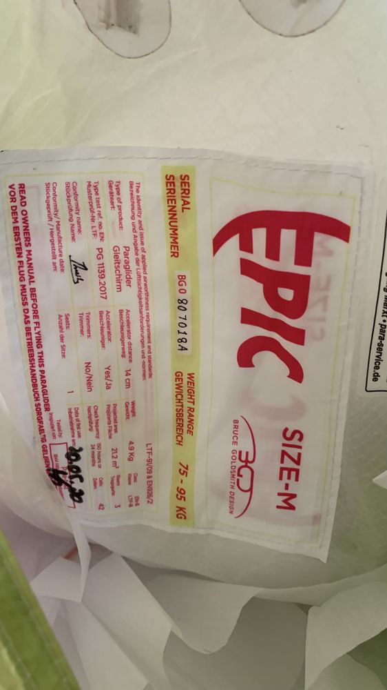 SELL: Wing EN B BGD Epic M 75-95kg No trees With listing bag No flying on the sand TC valid Concertinas No wate