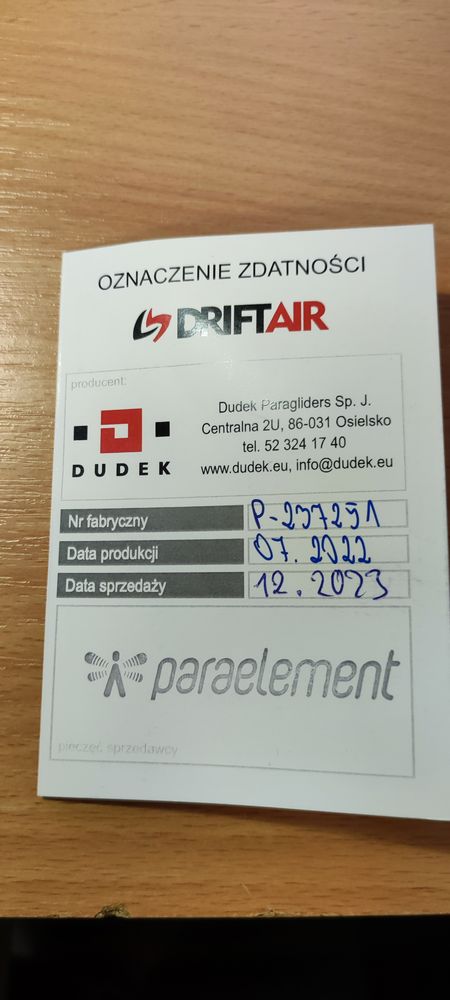 DUDEK DriftAir 20 – IN EXCELLENT CONDITION, sale 12/2023! Flown since April 2024 🪂 🔹 Model: DUDEK DriftAir 🔹 Size: 20 🔹 Serial number: P-237251 🔹 Production date: 07/2022 🔹 Sale: 12/2023 🔹 Max. take-off weight: 100–120 kg (up to 140 kg for experienced pilots) 🔹 Total flight time: approx. 50 hours 🔹 Always carefully folded into a cauliflower tree, stored only in a dry place. 🔹 Grass starts – only two small patches (see photo) 🔹 Never been in water, sand or on SIV ✅ Great for dynamic paramotor flights ✅ Precise control, playful but safe behavior ✅ Wing in excellent condition with good porosity ✅ Original documentation included 📍 Personal collection / possibility of shipping worldwide / possibility of test flight – Pilsen, Czech Republic (EU) 📩 €2190 👉 Premium freestyle wing for paramotor – in top condition, ready to fly! 🪂