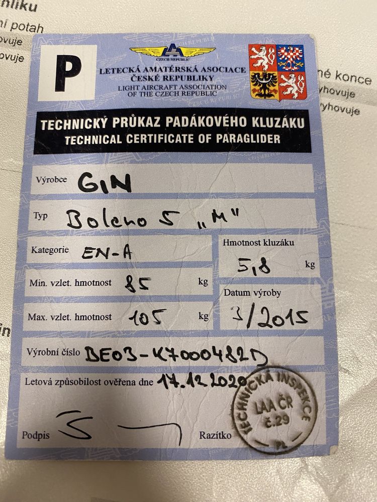 I am selling a complete paragliding set, ideal for beginners. It includes a Gin Bolero 5 wing, size M (85–105 kg, EN-A), which is very good and stable, ideal for learning and first flights. When flapping, it quickly corrects itself and forgives mistakes. It has recently been given a technical inspection, valid until February 2027. The wing is older, but in good condition and will serve well for a long time. The whole set is 35,000 CZK.