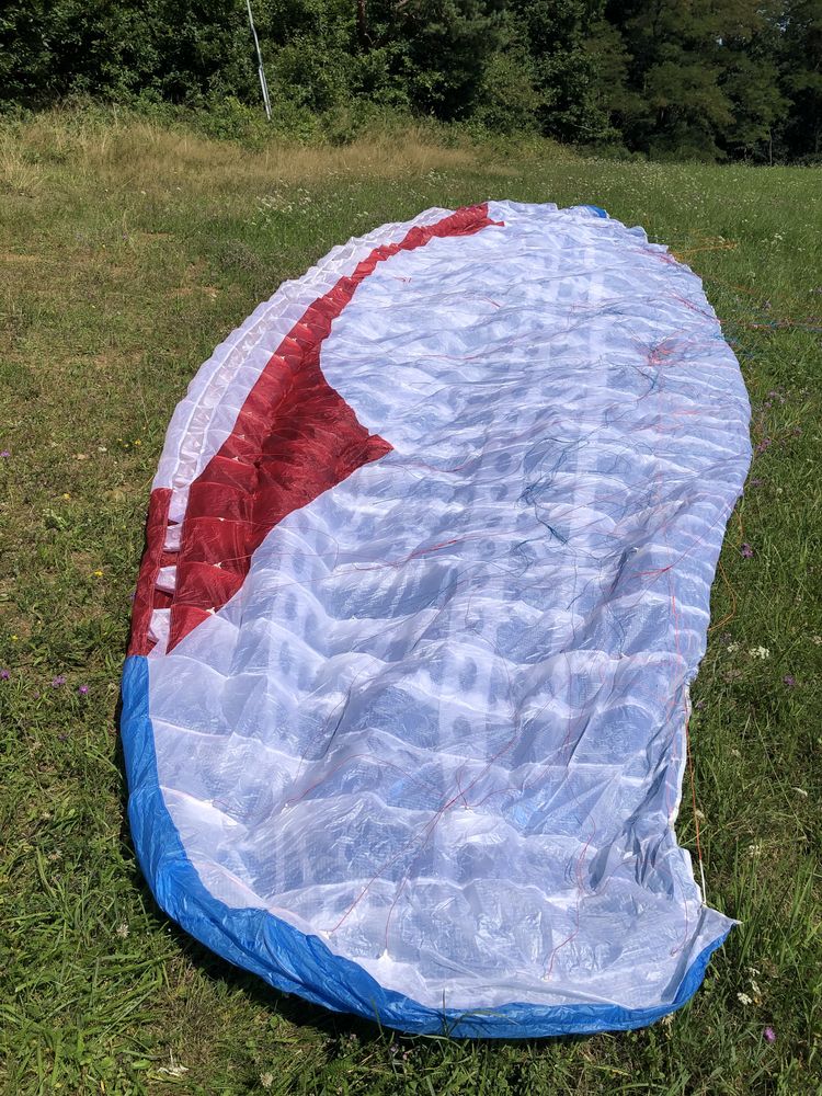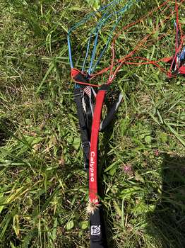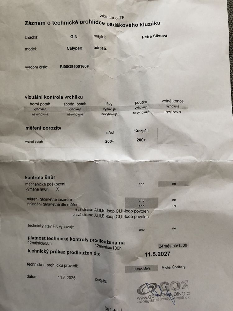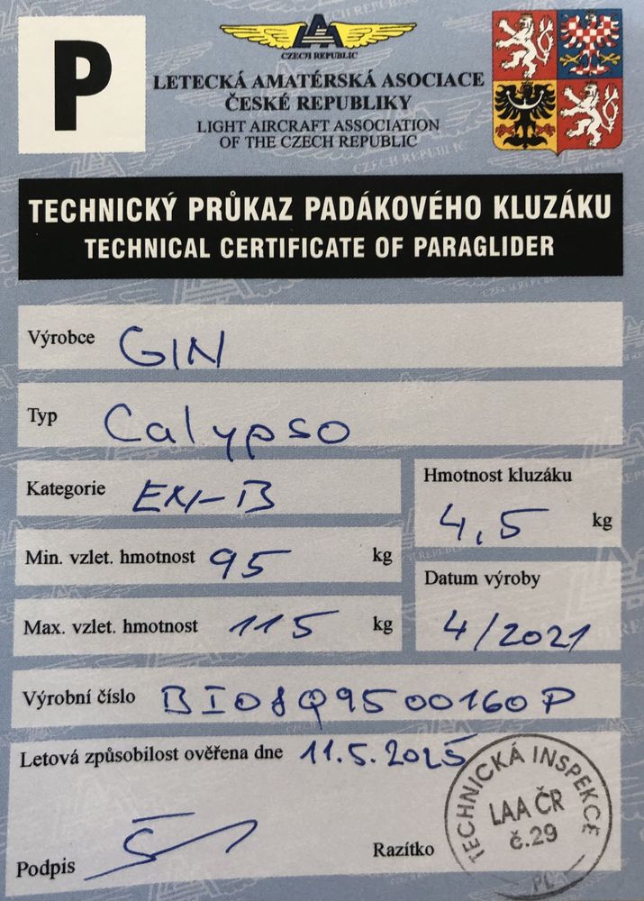 Unfortunately, I have to sell/exchange my great wing GIN CALYPSO. I bought it this year from Petra Slívová. Unfortunately, I chose the wrong size and I am 2 kg under the take-off weight and need a smaller wing. I have completed 3 flights on it, otherwise it has less than 100 hours of flight time, now a new technical inspection was done in May, see photo. This is a medium/higher EN-B, a decent, but at the same time powerful wing for both beginners and XC. I am not against exchanging it for a smaller one.