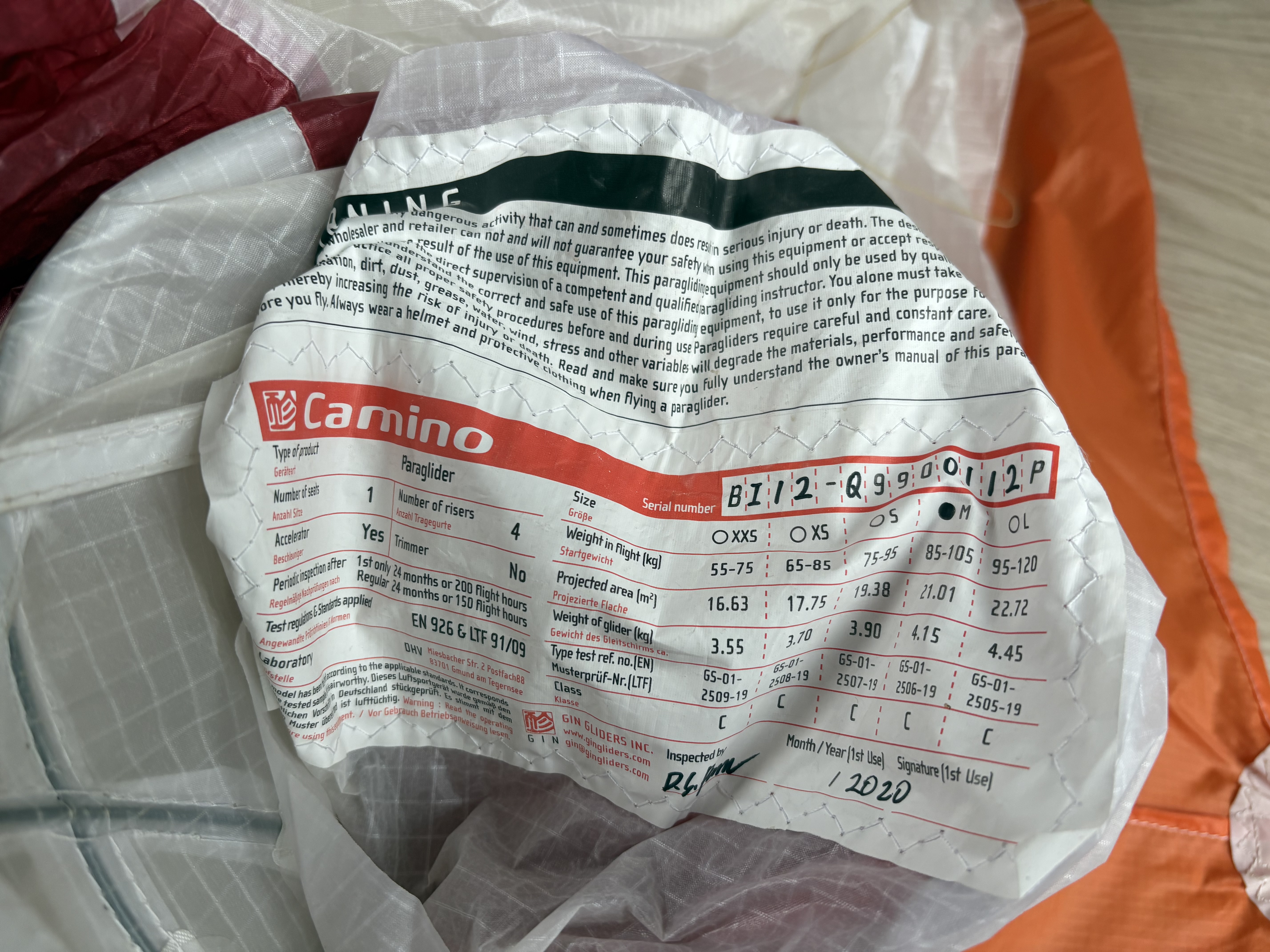 SELL: Wing EN C GIN Camino M 85-105kg Concertinas TC fresh Lightened No trees
