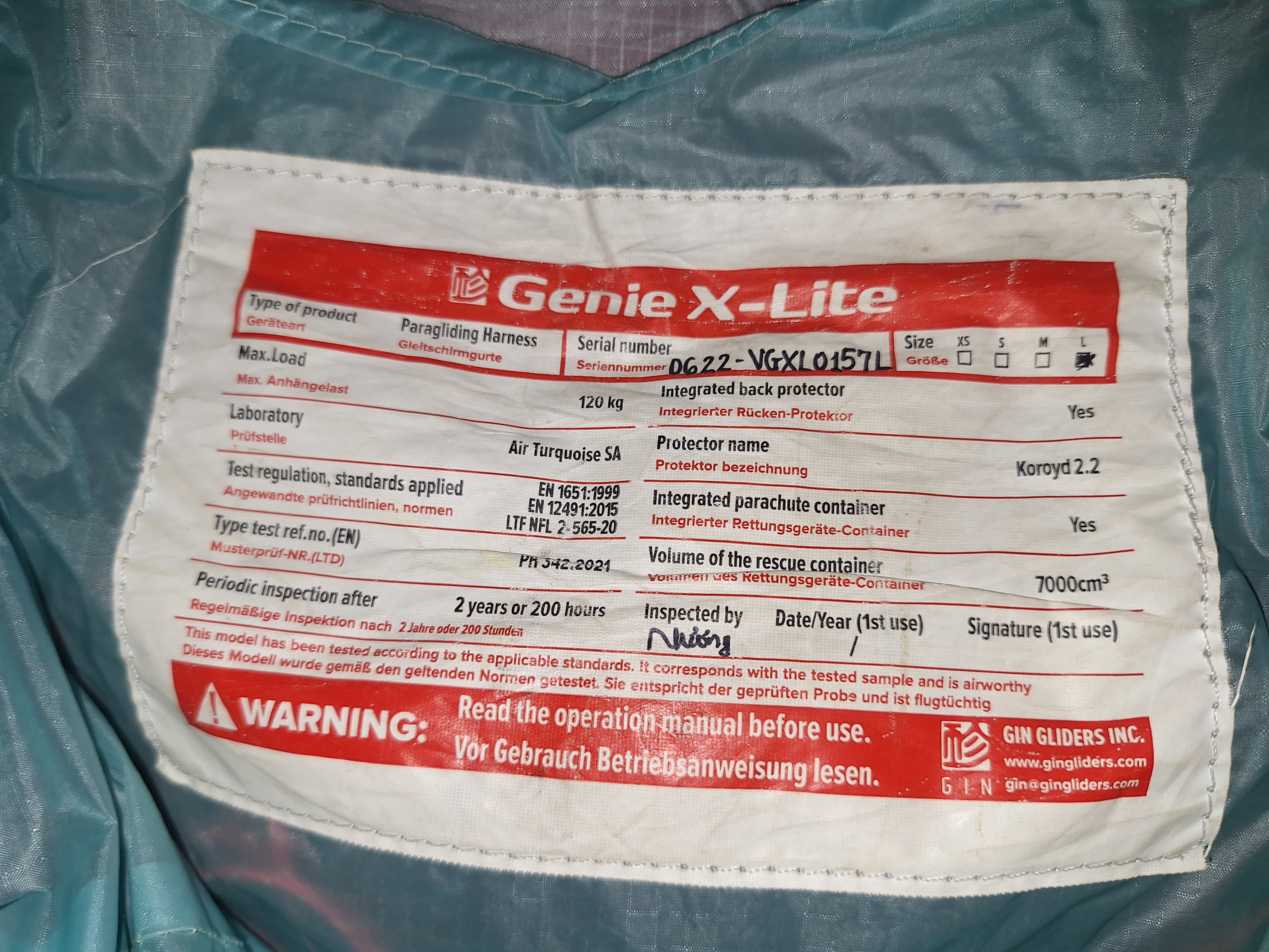 SELL: Harness For Advanced Gin Genie X-Lite L Used Reserve from below Fairing (cocoon) Carbines Soft-link carabiners Speed