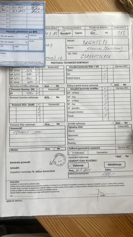 Fresh technical certificate valid until 3/2027 The wing is in perfect condition, which is also confirmed by the technical certificate (technical certificate by M. Kameníček). I hardly flew it, basically only one weekend, the previous owner also flew it a little and took care of the wing. I am also selling a basically new seat and a completely new spare wing. If I sell the set, I will also give a discount. The reason for selling is the transition to glider flying and there is no time for both.. :-(
