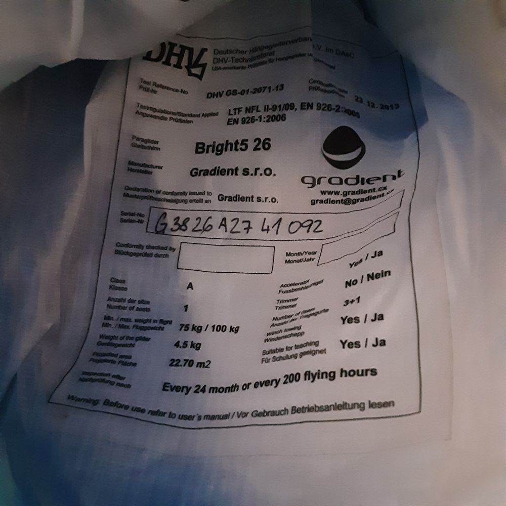 SELL: Wing EN A Gradient Bright 5 26 75-100kg Concertinas No flying on the sand TC valid No SIVs No trees (Part of a Set)