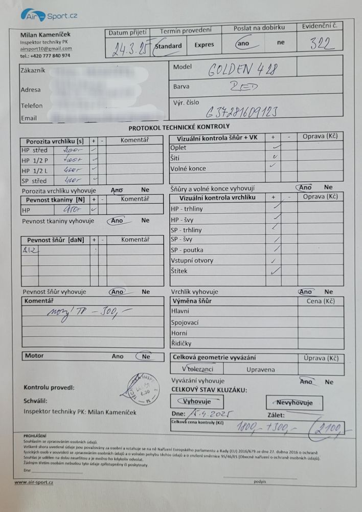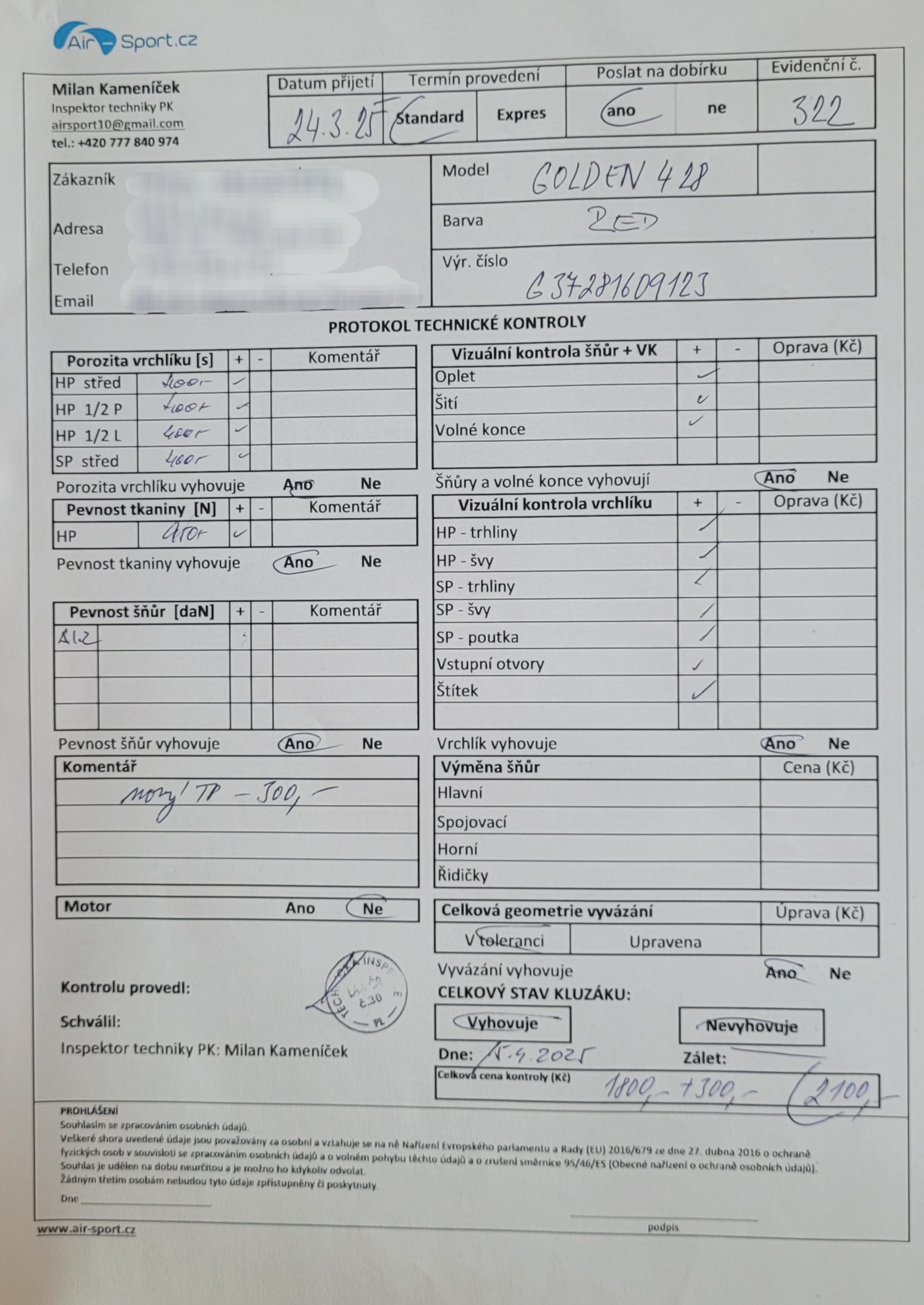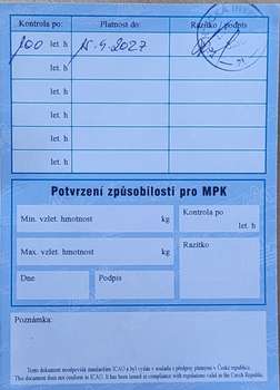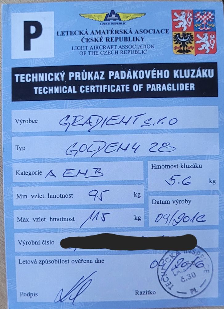 I bought the wing a few months ago. At that time, I was already at the lower weight limit without a load. Since then, I have lost over 10 kg. I tried flying with a 20 kg load, but it didn't work, so I will change to a smaller wing. I have only had 3 hours in the air on the parachute since the new technical inspection. Only the previous owner flew it before, but the technical inspection passed the regulations perfectly. The new one is valid until 9/2027.