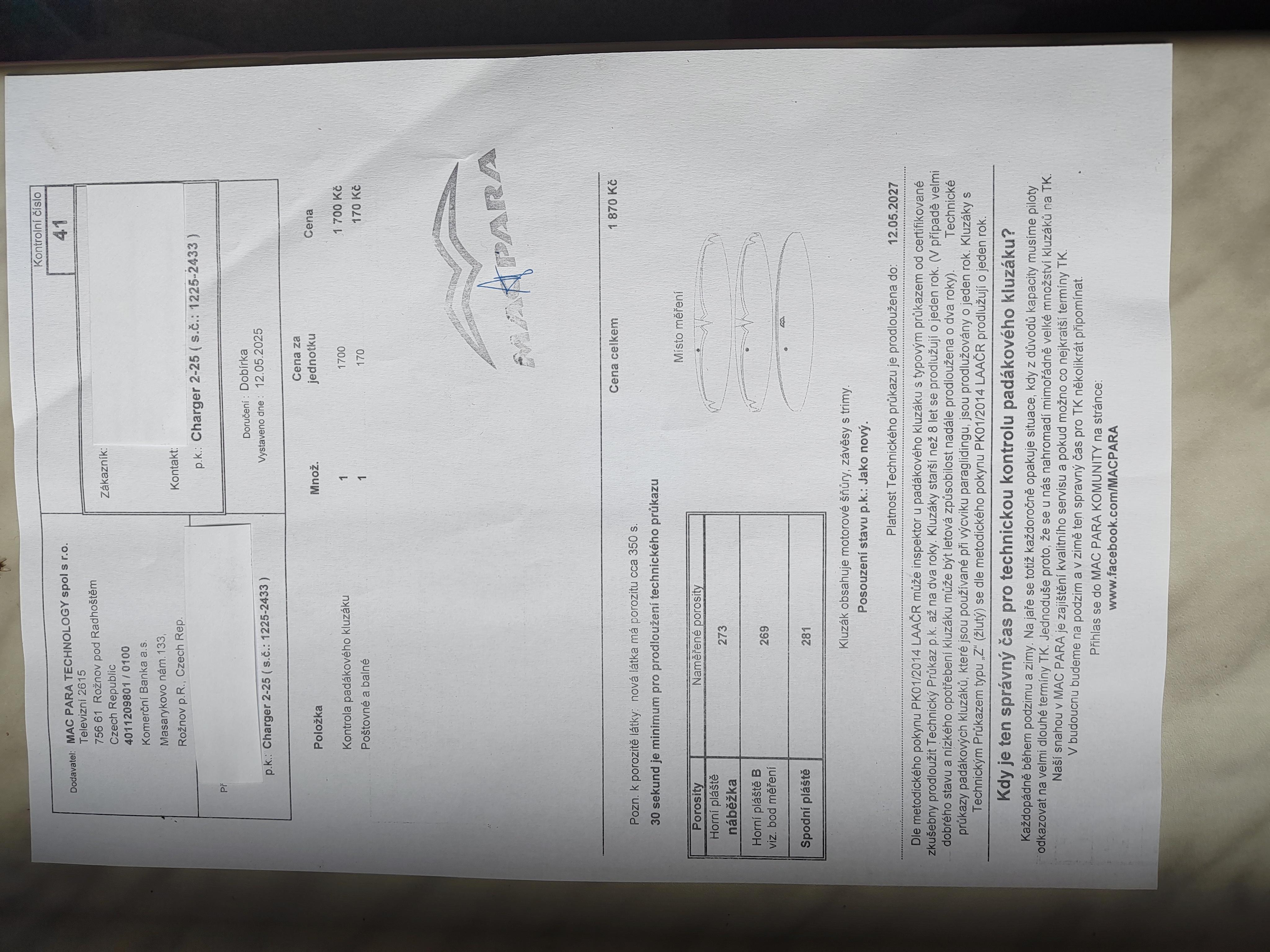I am selling CHARGER 2, size 25. Year of manufacture 2022. Color Lime. Complete take-off load 102 - 140 kg. Flew within 15 hours. Technically fresh until 5.2027. Price: 49,000 CZK. New canopy condition.