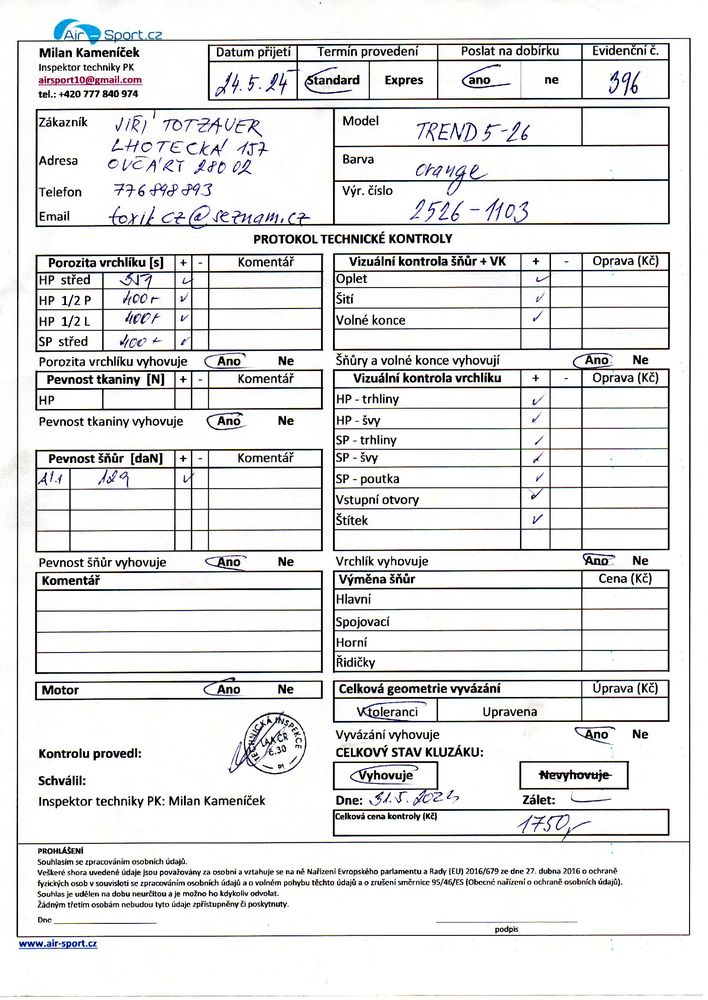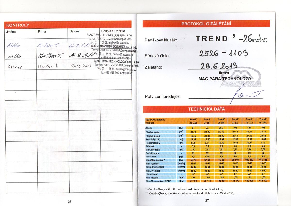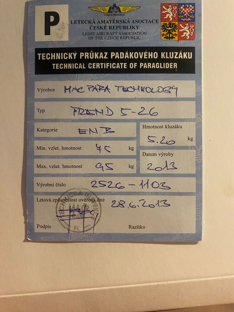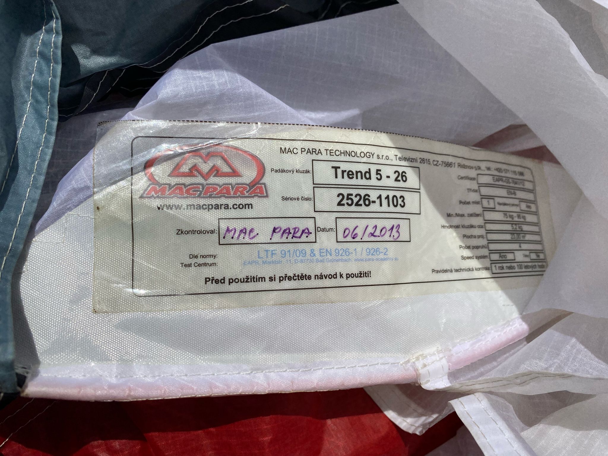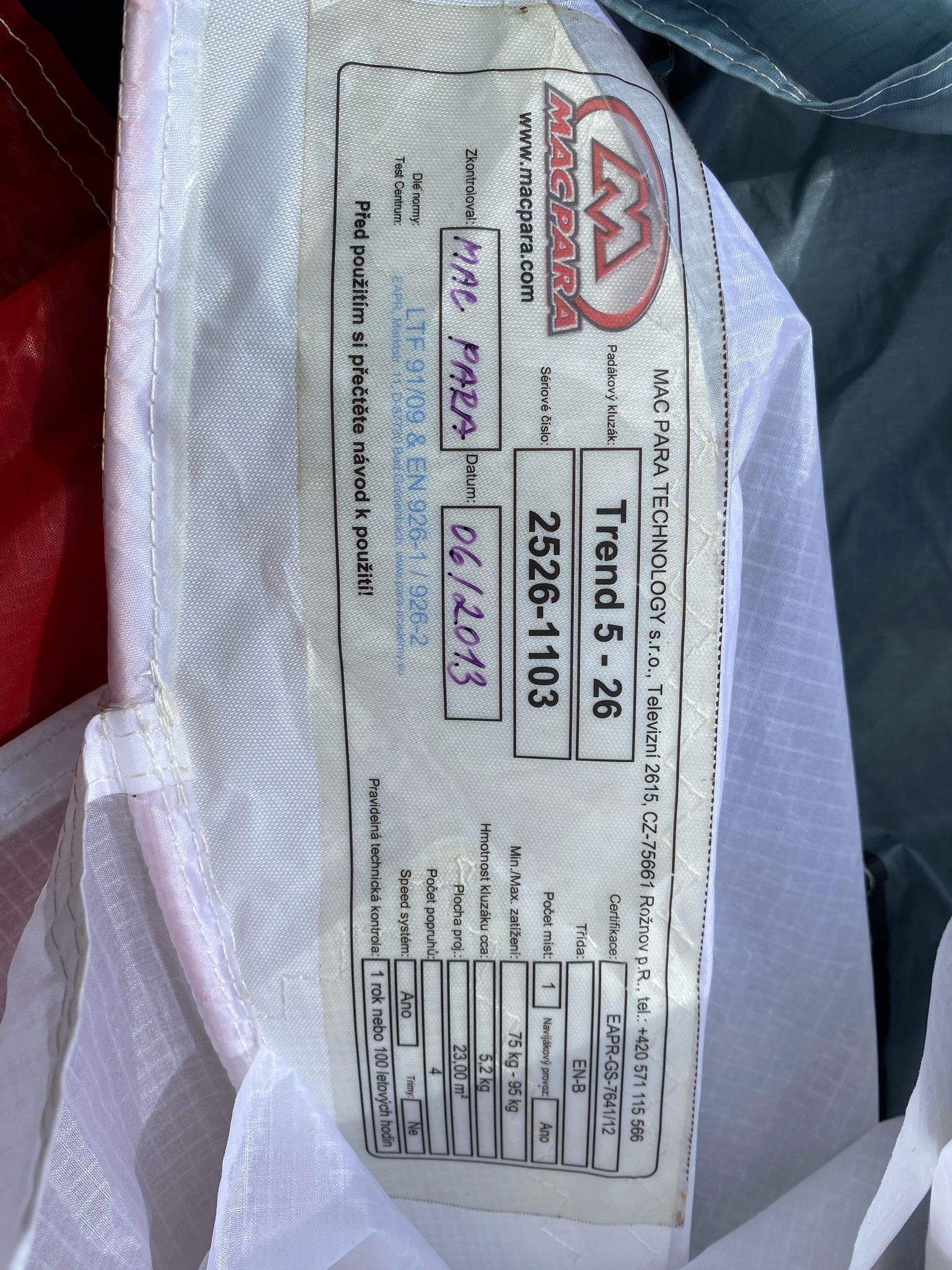 I am selling a Mac Para Trend 5 wing, size 26, tied to a motor -100-127kg, weight 351+see MOT report until 4.6.2026