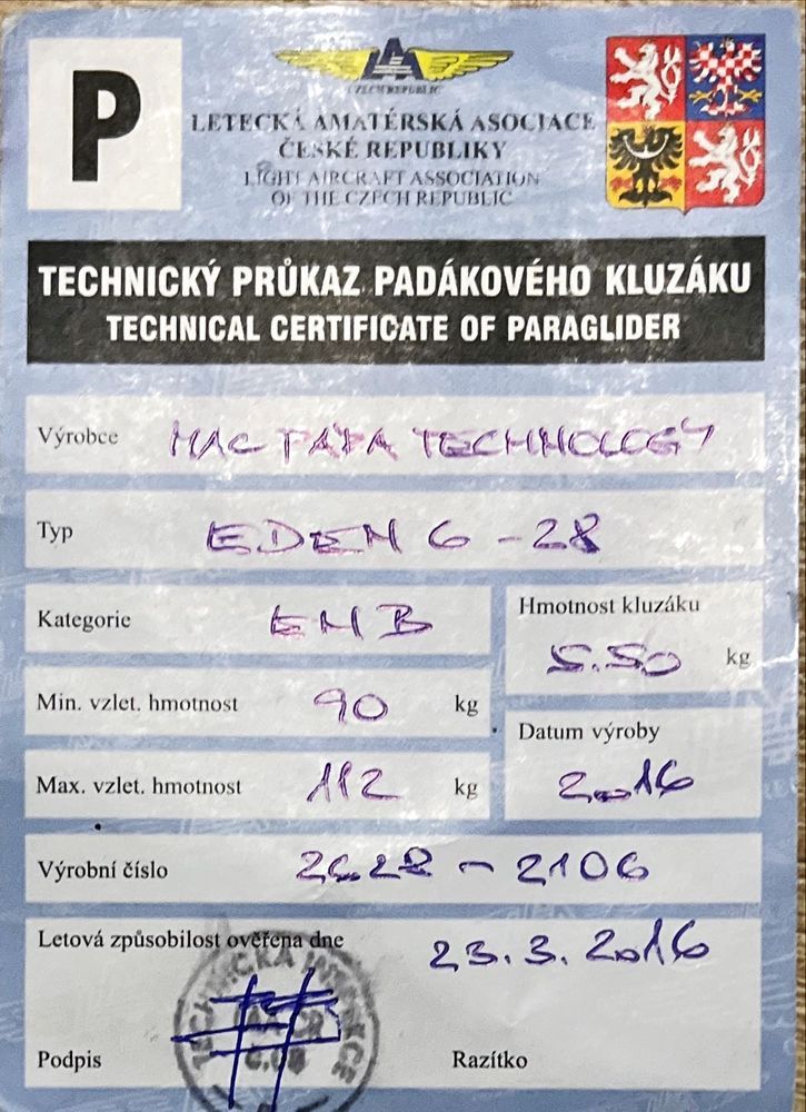 I am selling this great wing. It has already been flown a few times, but it is in decent condition, always carefully packed and stored. Fresh technical certificate valid until 12/2026, the wing will certainly serve for a few more years. Suitable as a second wing for skilled pilots. I am selling it due to lack of use, it has just been lying in my closet for the last year. Honza