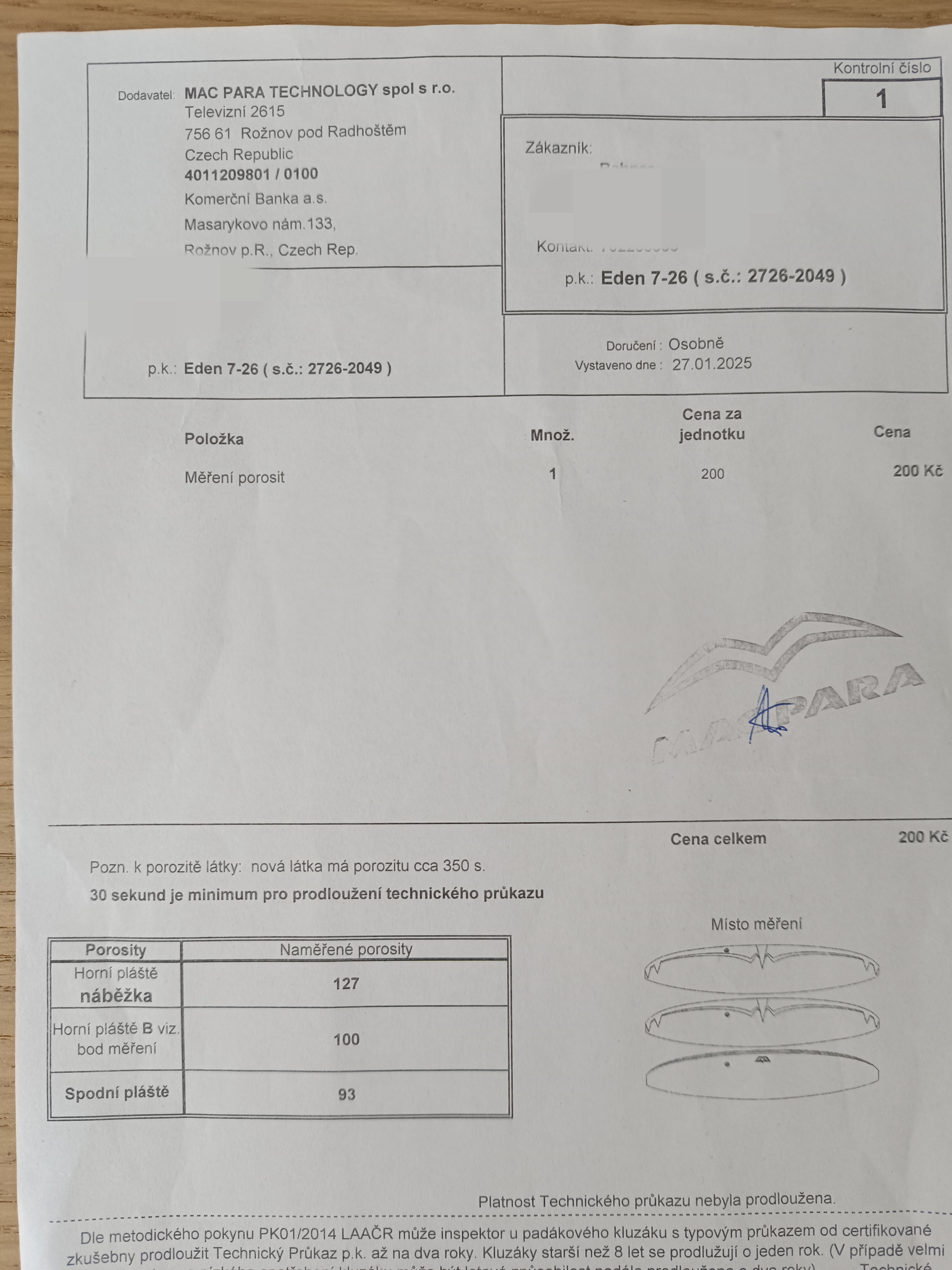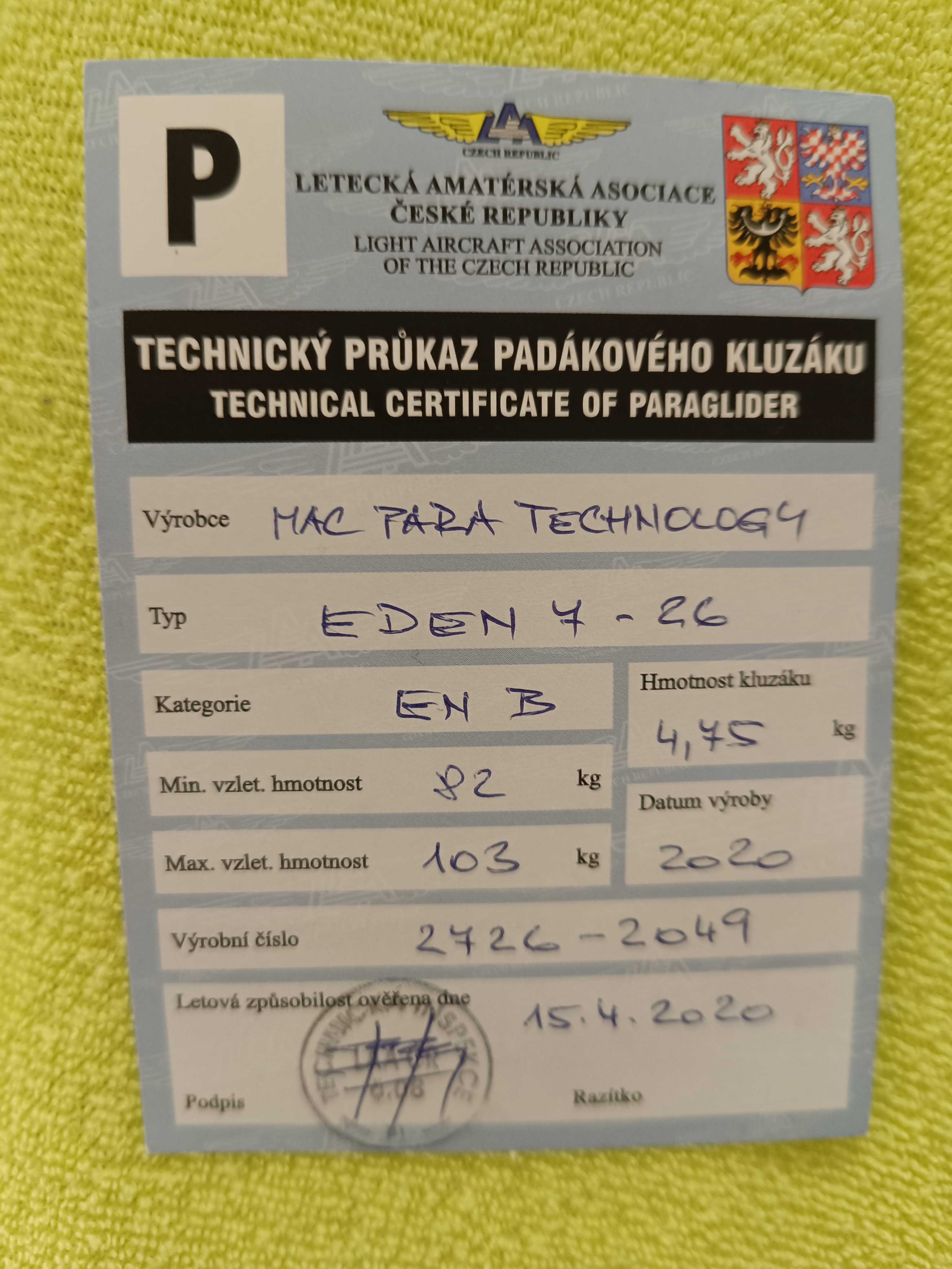 I am selling a MAC PARA EDEN 7 - 26 82-103 kg. year.4/2020 TK valid until 11.3.2026 I purchased the parachute from the first owner and had the porosity measured in the MAC PARA viz-protocol. The parachute is in beautiful and undamaged condition. I flew the Eden 3 times and it is very pleasant both in thermals and on slopes. EDEN 7 has one place taped over, see photo. Possibility to add a cocoon chogori seat + 19000 CZK or an open karpofly. +6000 CZK. both in size M. A year old Sky system 3 110 kg bookmark. + 9000 CZK. Backpack 1500 CZK. Quick negotiation possible. More info by phone. My ads can be combined.
