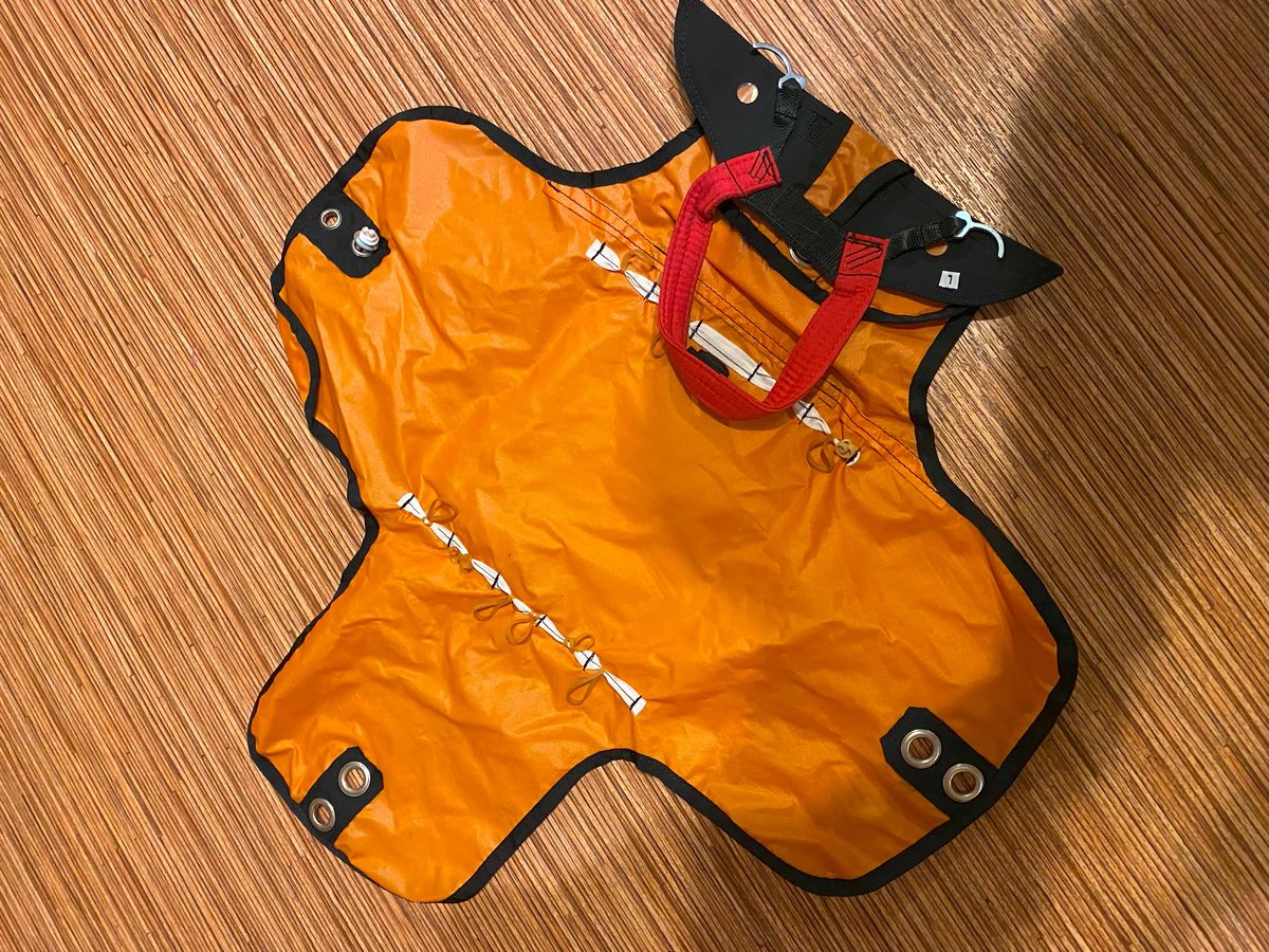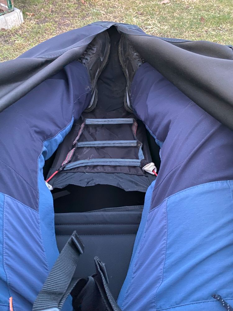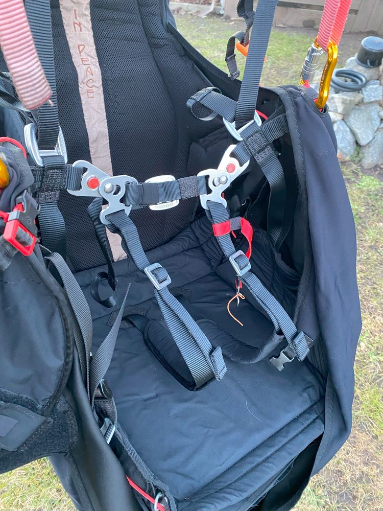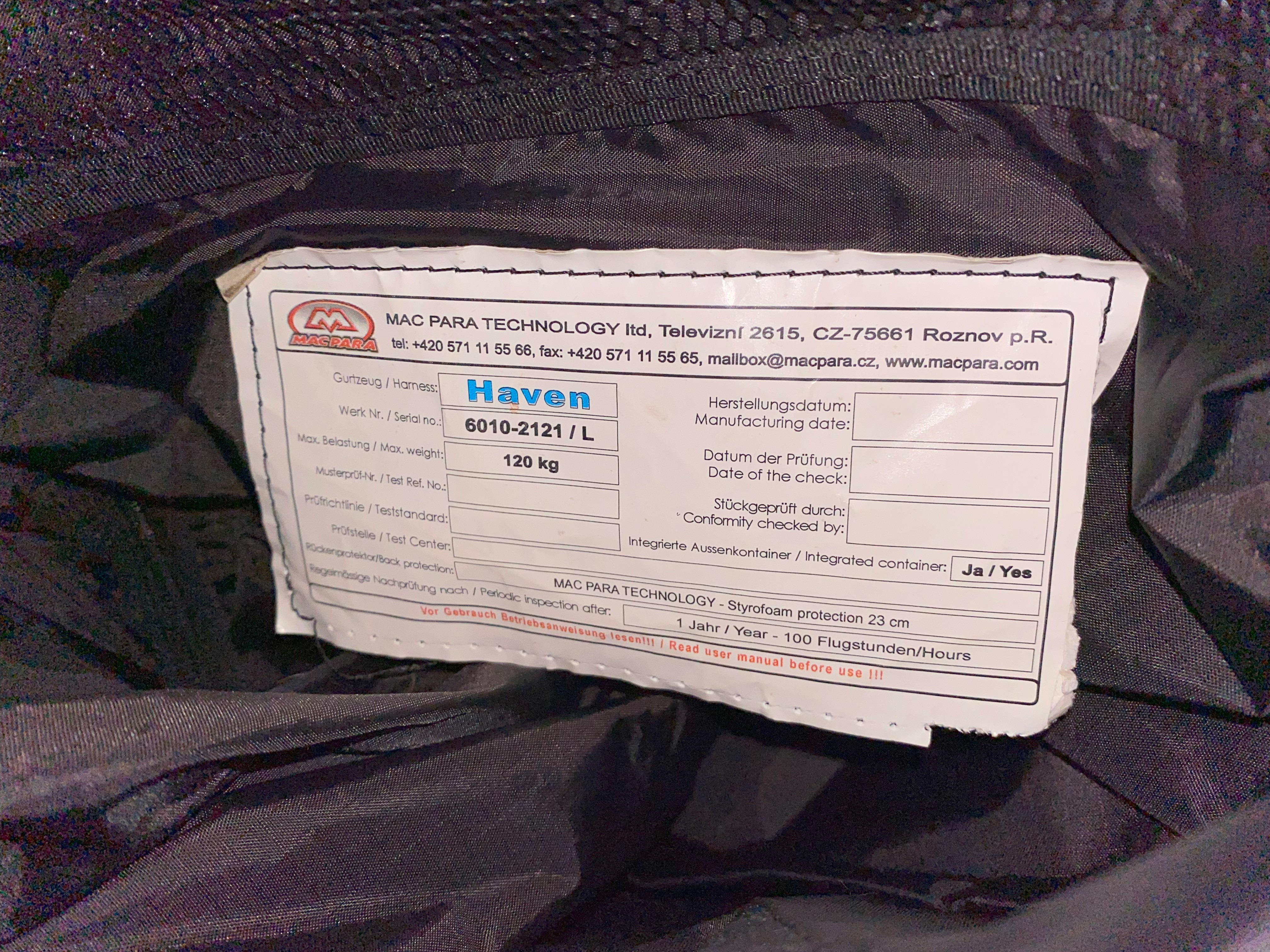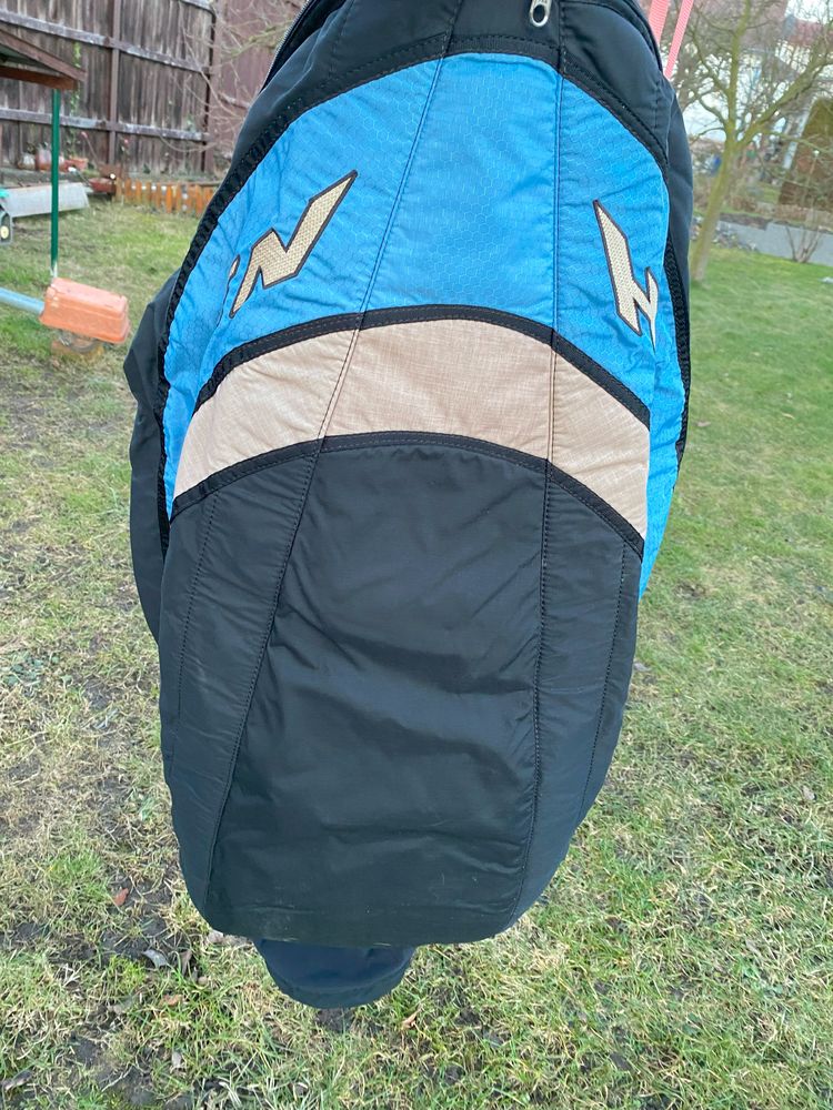 MacPara Haven size L The seat is in good condition, not damaged anywhere. The construction is very robust, classic with a board. Foam protector 23 cm, protects the entire back. The tab is placed under the thighs, the speed is 3-stage. Harness weight 5.5 kg. Includes 2 original containers for the tab. I am 183 cm tall. The seat is very comfortable for long flights, with wide adjustment options. Can be tried in the Klatovy area.