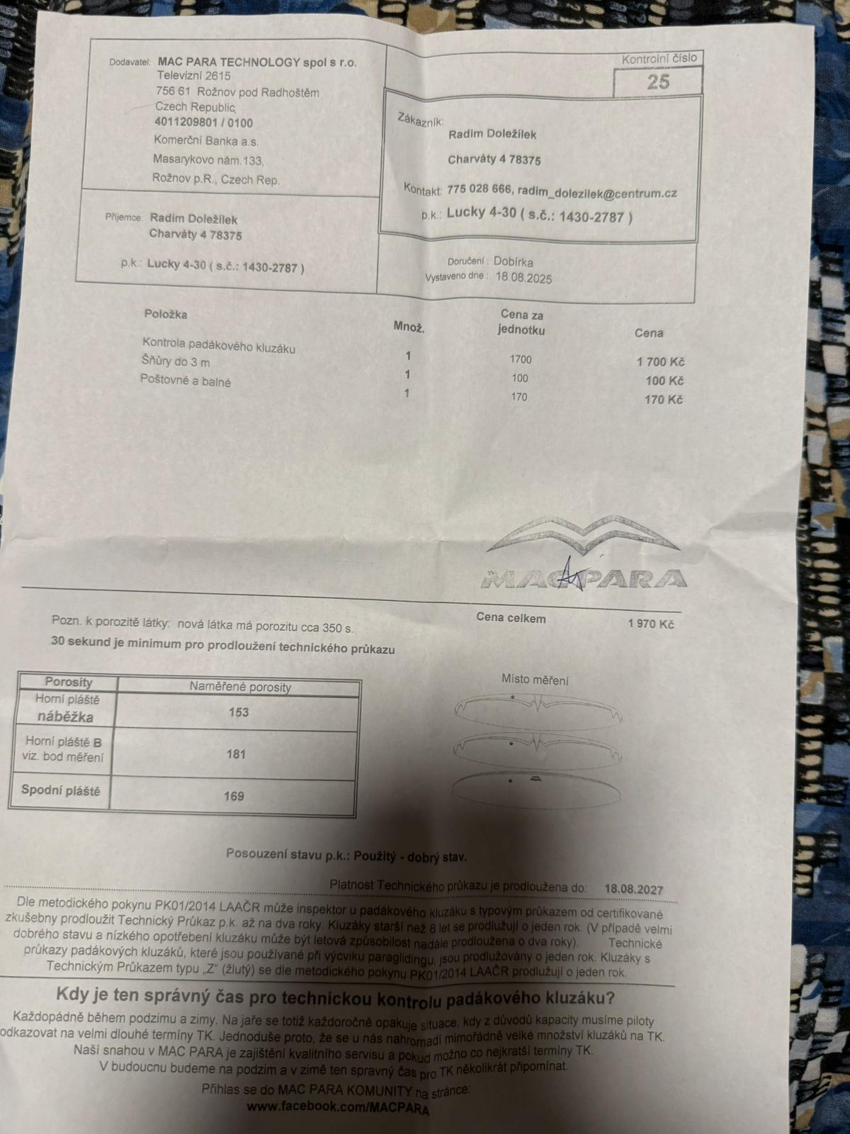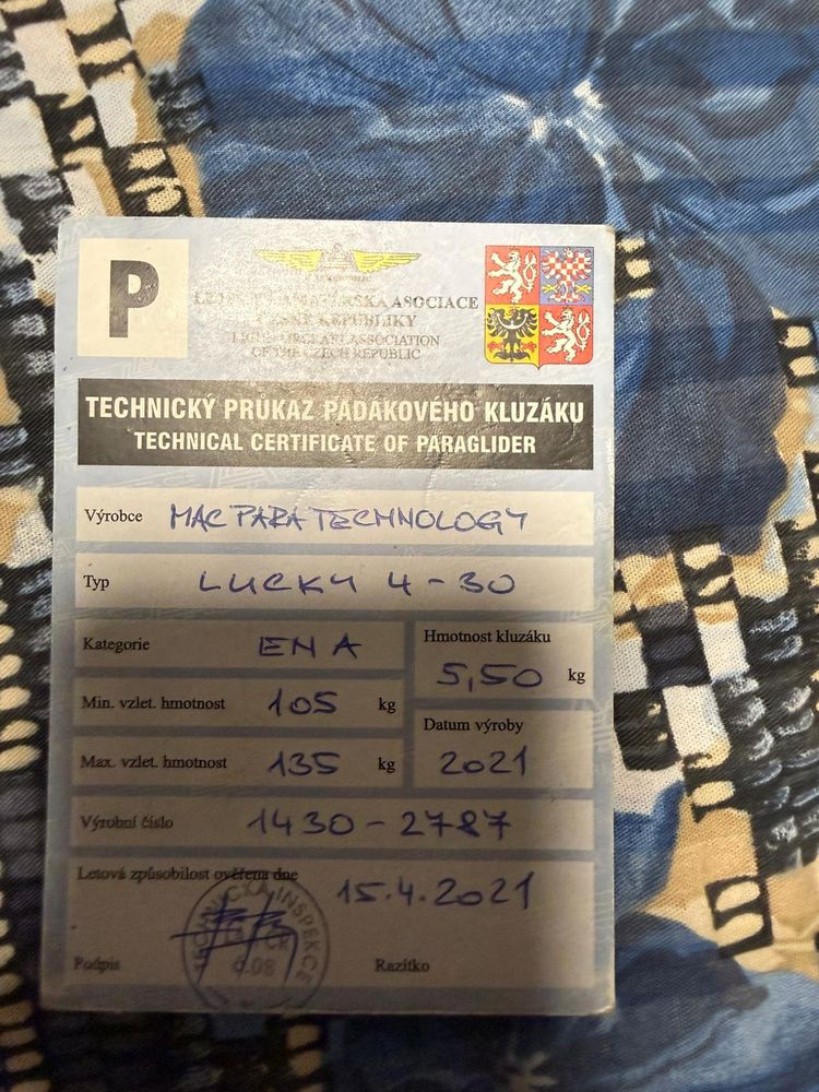 Paraglider MAC Para Lucky 4 -30 - size XL (105-135kg) (2021) (new technical). The parachute is in great condition. Technical report on request. I will also throw in a Sky Porter pouch and backpack. Everything is ready for the season. Price 16000 CZK. Tel: 775028666