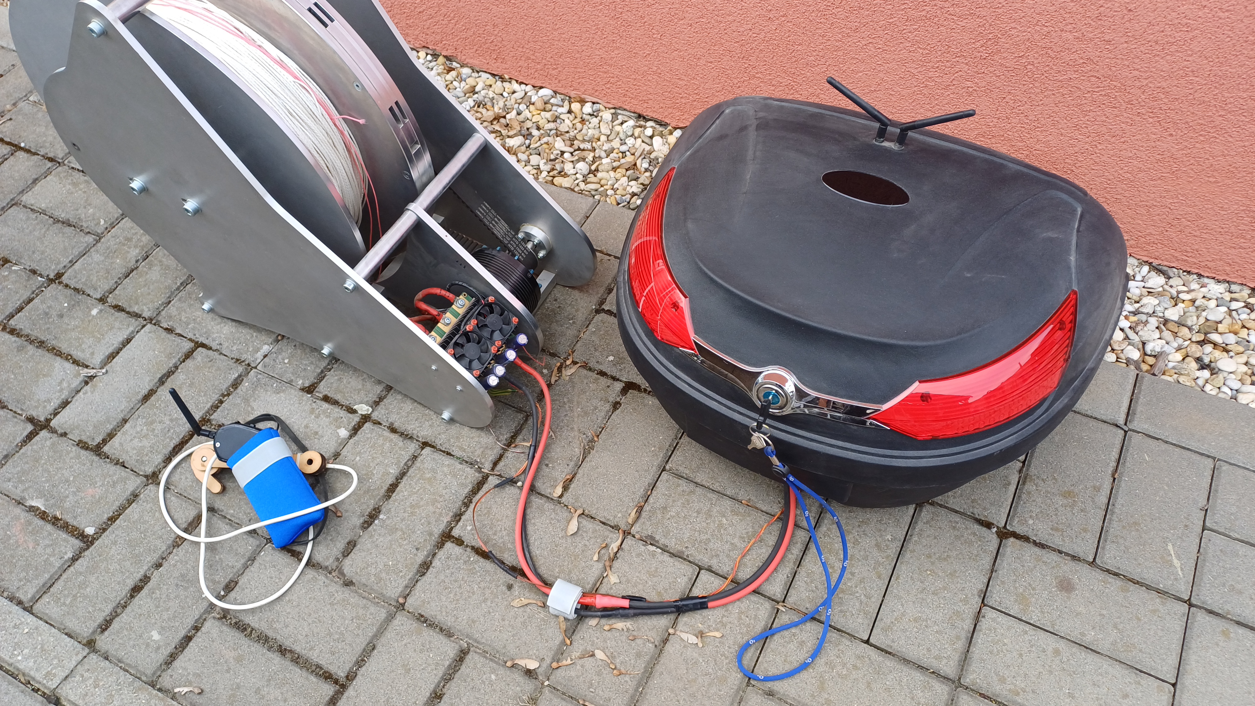 Remote control winch, electric motor drive, 63 V battery. Reached height depending on the weather 300 to 450 meters. Climb speed depending on the pilot's weight 3 to 5 meters per second. Magnetic clutch ensures very precise pull value, both when winding and unwinding, without any jerking. I will send videos of operation upon request.