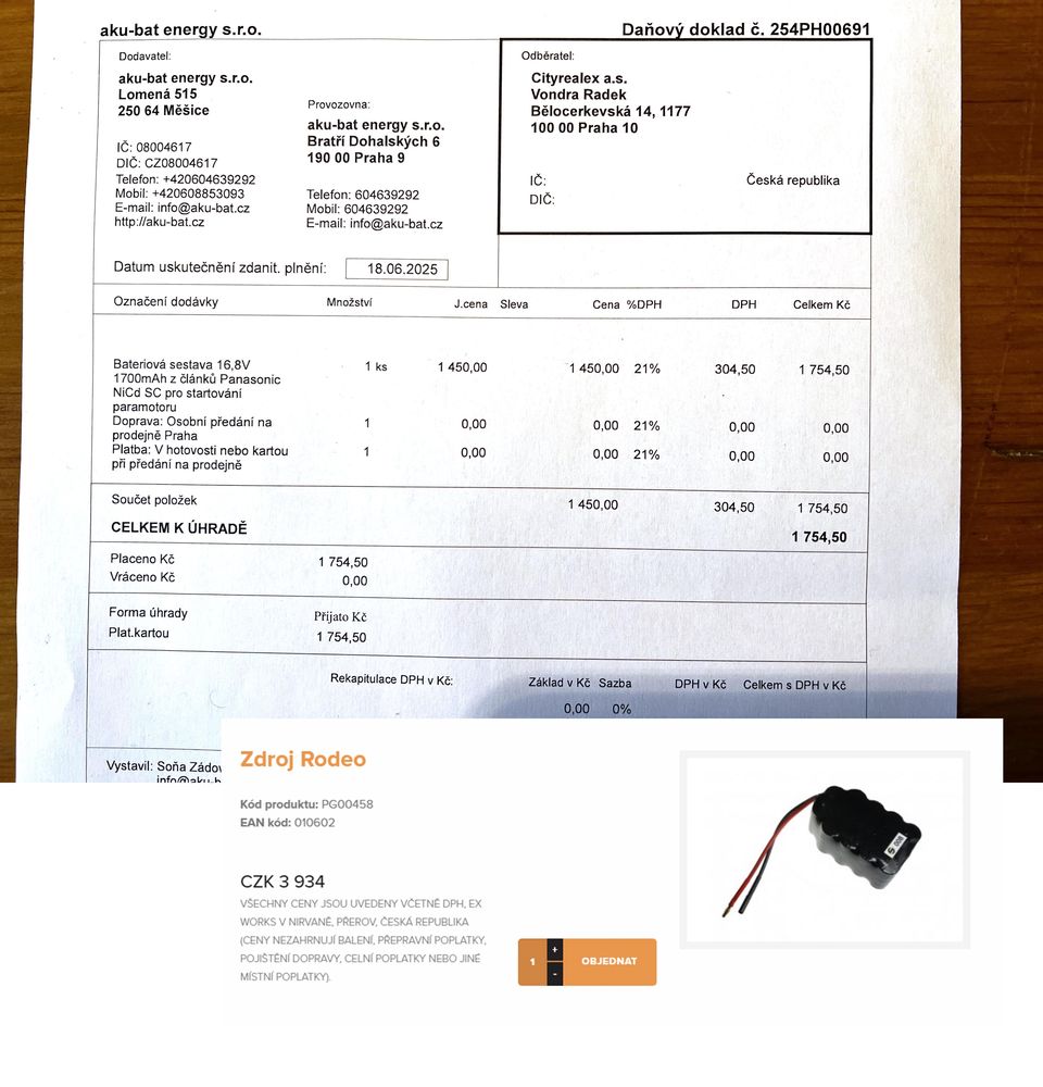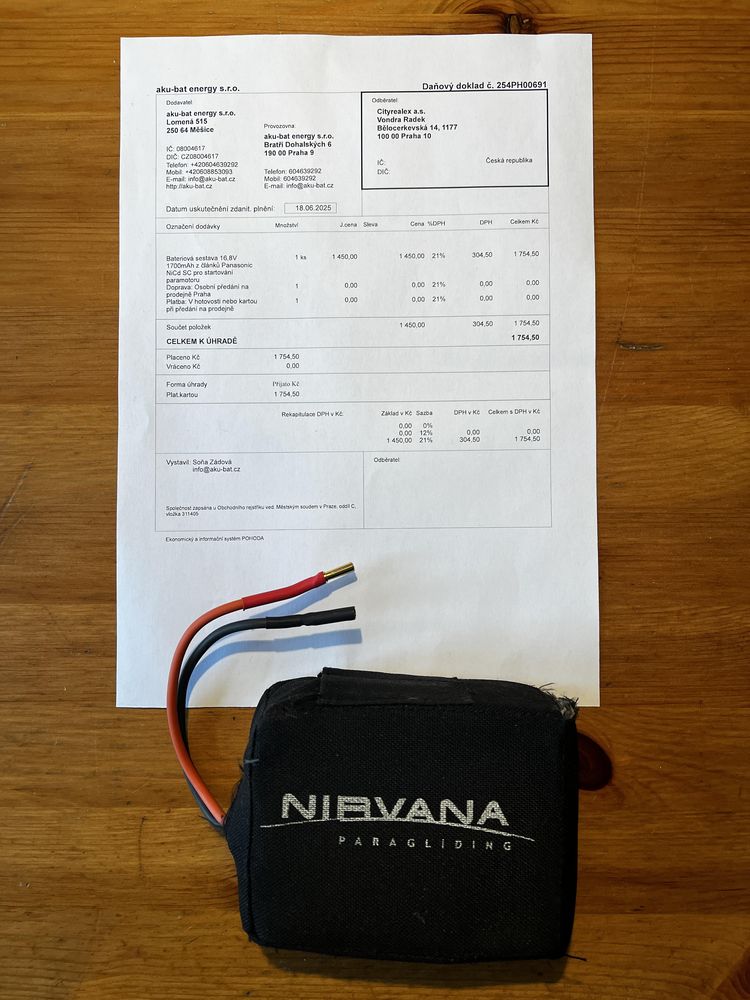 I am selling a new, never used battery for Nirvana - e.g. Rodeo or Electric. I bought it in a specialized store ACU-BAT (see invoice) this year on June 18, 2025 and it has never flown. I thought I would fly, but it didn't work out. I kept the battery at room temperature and at an optimal charge, i.e. about 80%. So it is in the condition of a new battery. I paid 1754 CZK for it, the price from Nirvana from the e-shop is 3934 CZK. I will give it away for 1200 CZK. I will also sell a Pelikan - SHARK20 model charger in a complete package. The price of the charger is 600 CZK. I will also sell it separately.