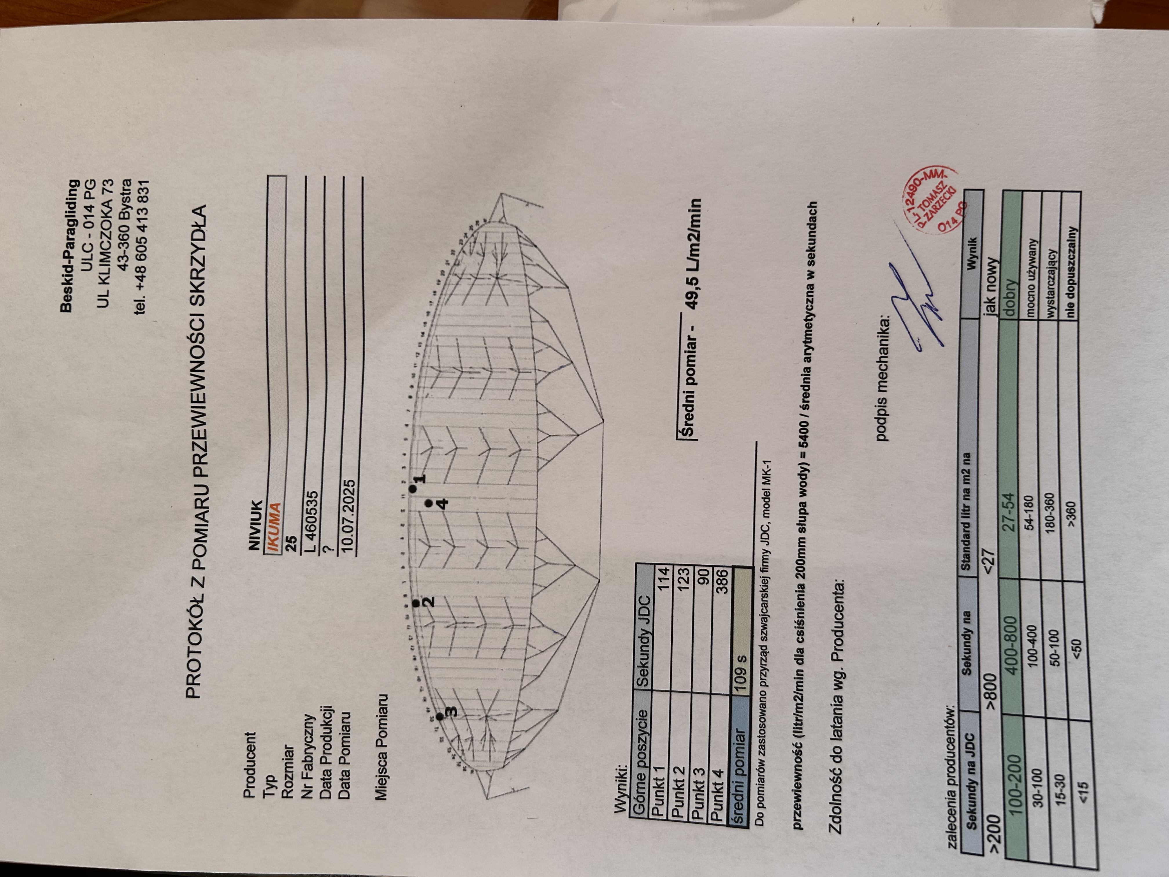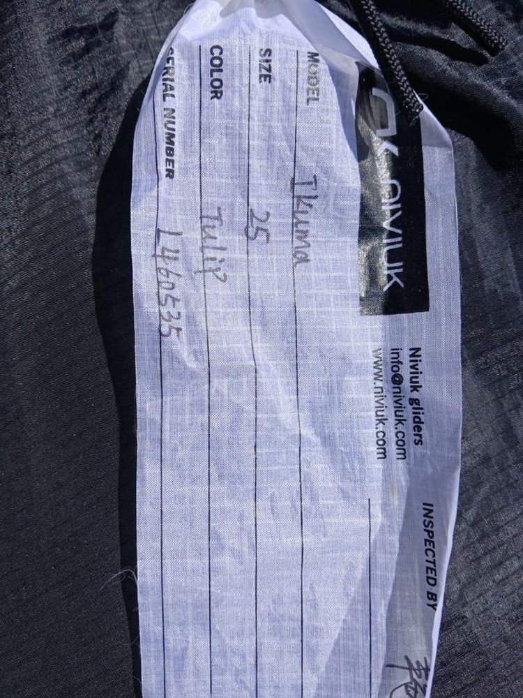 I am selling a Niviuk Ikuma 25 wing for a pilot with a take-off weight of 80-100 kg. A good wing for safe cross country flying. It has one small grasshopper stain, repaired by a paragliding center. The wing is in Poland, but it can be sent directly to a Czech address or to a friend in Prague, where it can be picked up and paid for on the spot. If you have any questions, feel free to ask.