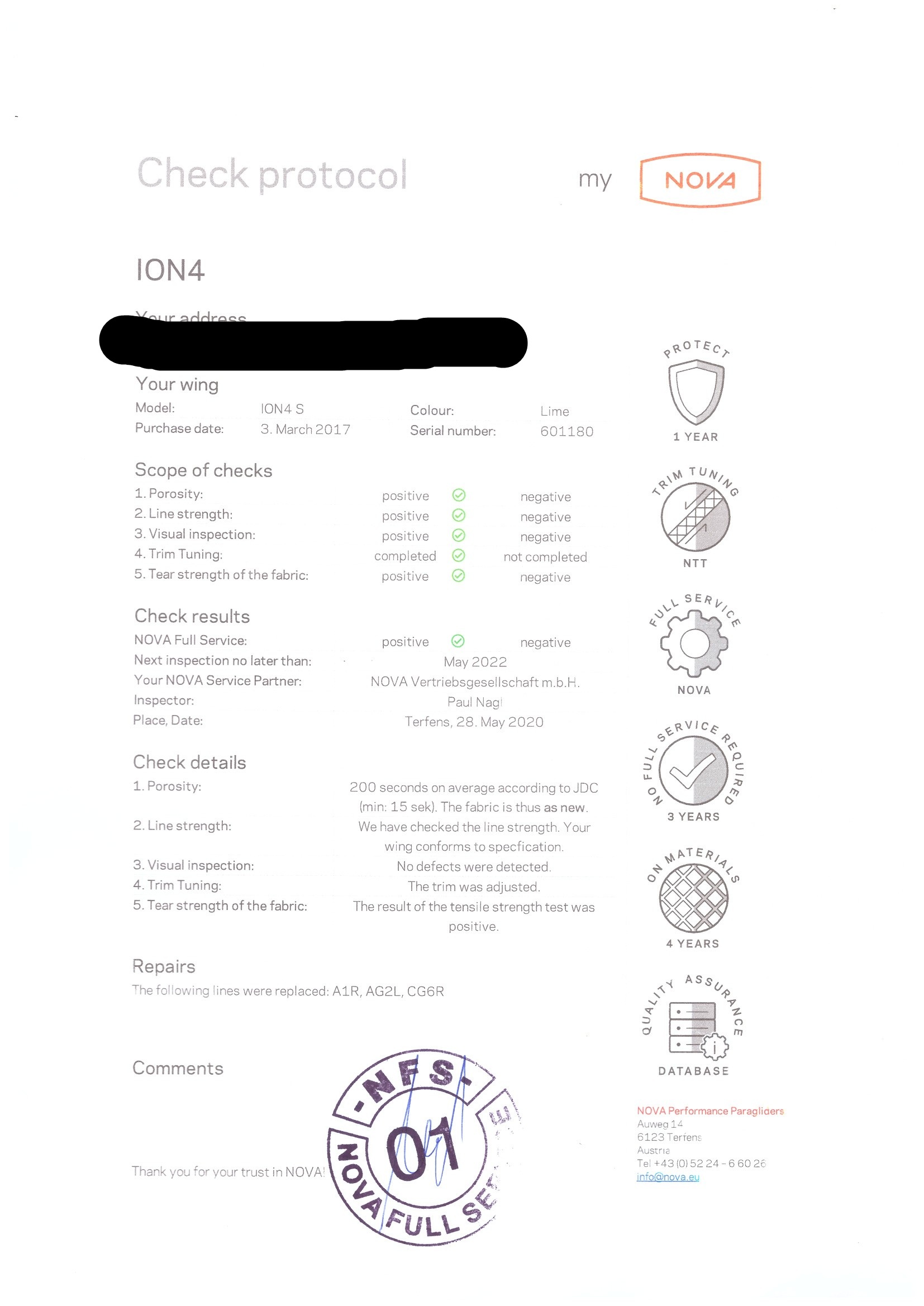 I am selling a Nova Ion 4 wing, size M, load capacity 80-100 kg, weight 4.65 kg, porosity on average over 200, production date 02/2017, I do not know the exact number of flying hours (around 100 hours), I am the second owner (purchased 04/2020). I have a complete set of NOVA service documentation for the wing. The wing is brand new, only minor repairs such as replacing the cord with a technical one, which is a common thing. Not flown since the last technical one. The technical one failed due to lack of use. If you are interested in buying, I will send you a technical report.