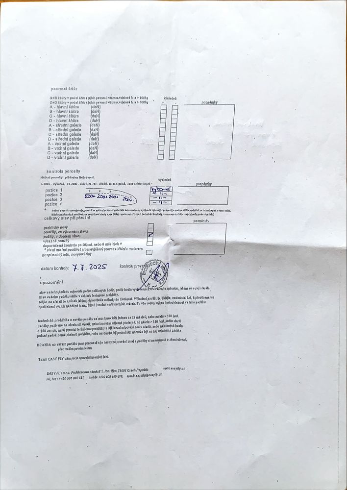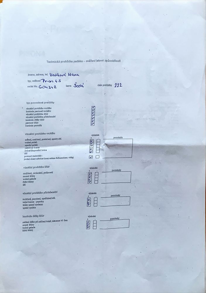 I am selling my good wing Nova Prion 4, size S (for pilots 75–100 kg). This is an EN-A category glider, suitable for beginners or for those looking for a safe wing for leisurely flying and thermals. The wing has a recent technical inspection valid until 8. 7. 2026. The porosities are 200+ in all points, so it is in very good condition and will serve you for a long time (more than 200 is not stated, the value is much higher when measured). The glider originally comes from Switzerland and I am selling it due to moving to a higher category (EN-B). The original Nova packaging is also included. I will be happy to send more information and videos in messages on Whatsapp, maybe we can come up with a different price tag. Possibility to try it on Javec.