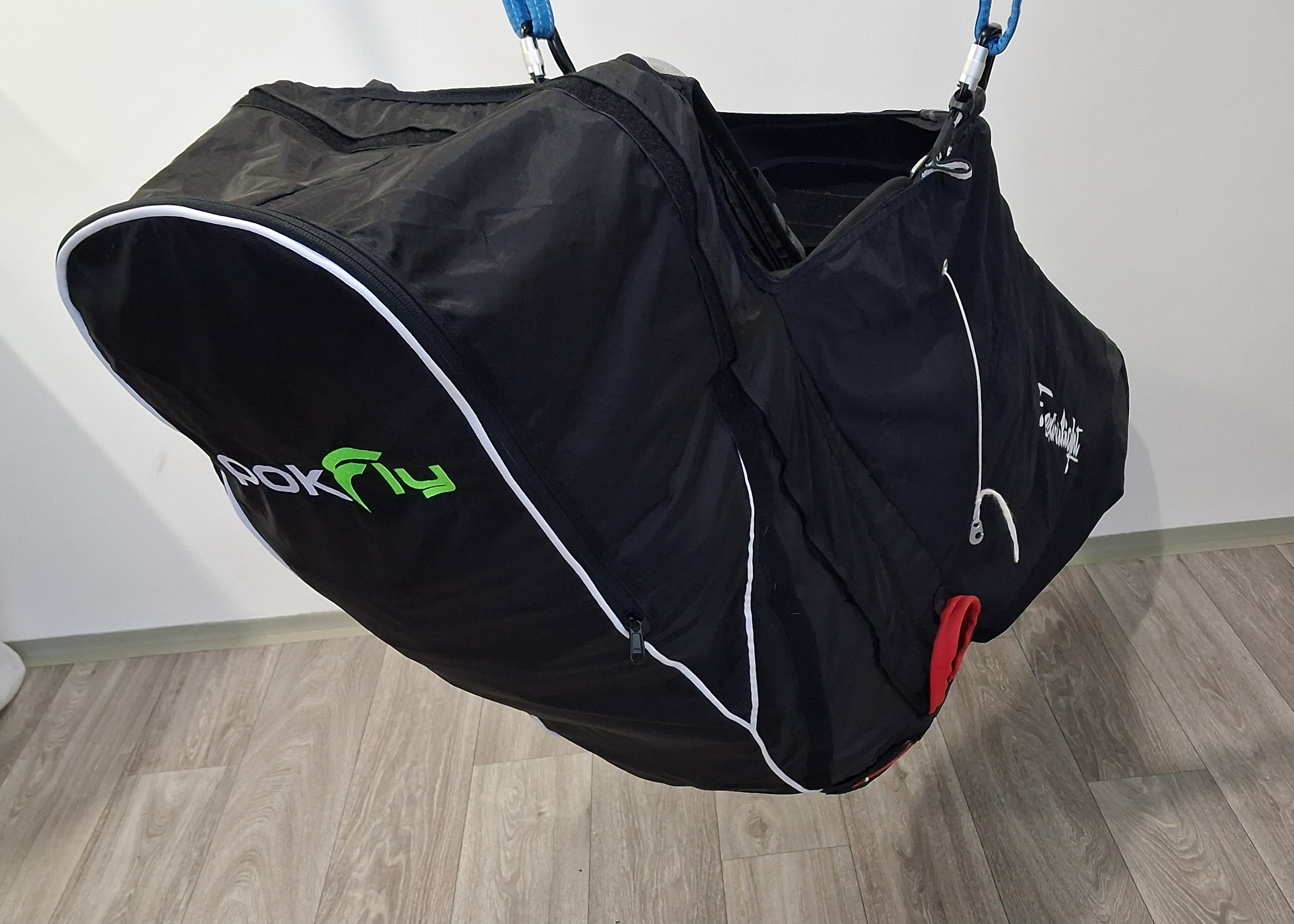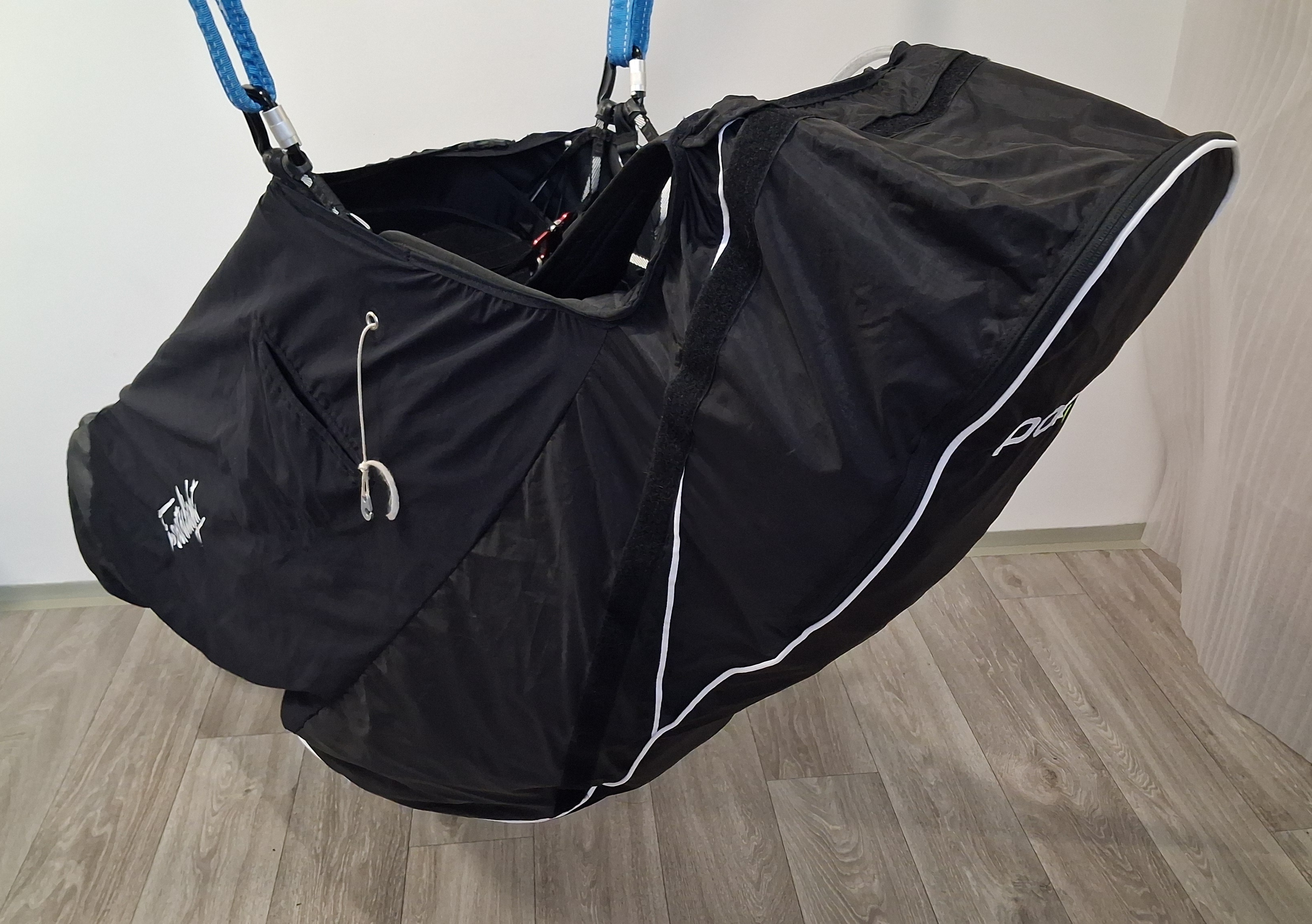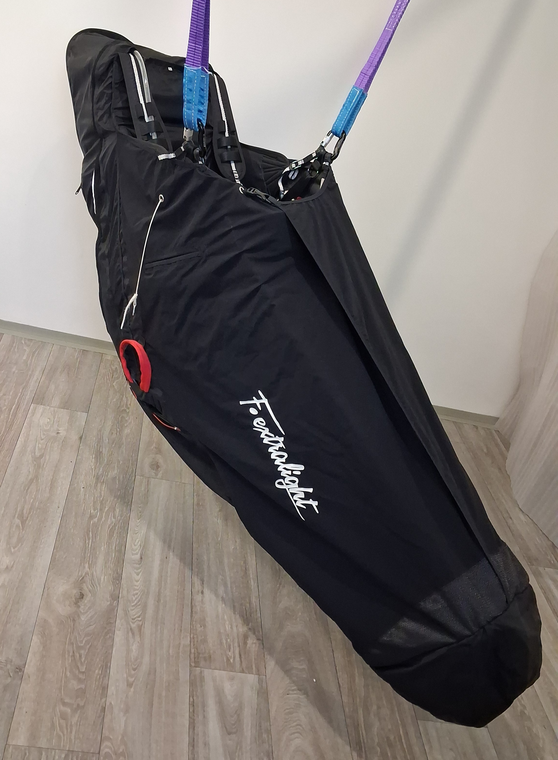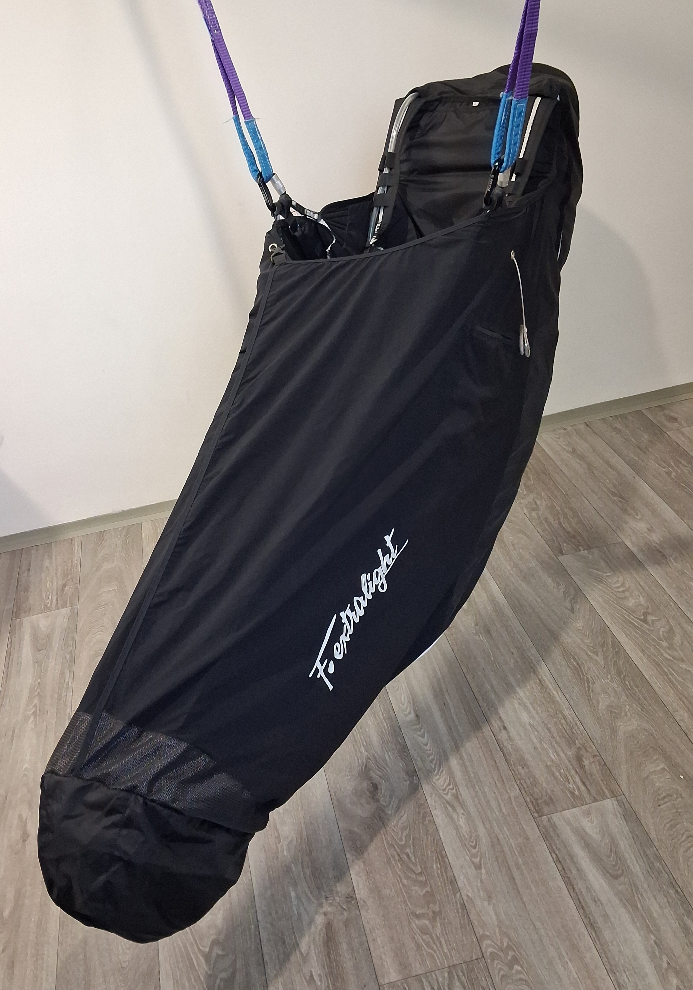 I am selling a POKfly Extralight 6000 L seat. New seat condition!!! EXTRALIGHT 6000 - Hike and Fly harness Extralight is an exceptionally light, safe and very comfortable pod harness. The weight started at 2.95 kg in size "M". The harness is designed for XC flights or Hike and Fly. It is light, but also made of material that can withstand harder landings. Extralight is equipped with an inflatable protector. The main advantage of the inflatable protector is that it is effective immediately after takeoff, thanks to the fact that you inflate it before takeoff. Unlike standard protectors, it differs in that you can completely deflate the protector while traveling, thus achieving maximum reduction of the folded harness. Extralight 6000 is an ideal harness for flying. Added elastic for safe boarding after takeoff, The size does not fit me.