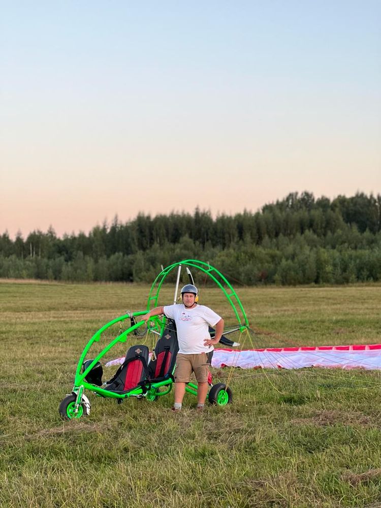 I am selling a large, beautiful tricycle! Rotax-503 engine. Maximum 20 hours of use. Electric starter. Propeller 1600 mm. Thrust 145–150 kg. Suitable for flying with a heavy pilot and passenger. Aluminum frame. The entire tricycle weighs 106 to 120 kg. Depending on the wheels, the ones we have now are heavy! High safety for the pilot and passenger! As with a buggy, the head is protected by a cage. All three wheels have shock absorption. The pilot sits in the front, the passenger in the back. No need to change the suspension point. The fuel tank holds 27 liters. Approximately 3.5 hours of flight. Comfortable seat belts. Comfortable seats. Includes a Dudek Cabrio-42 wing. The wing has 50-60 flight hours. Call if you have any questions.