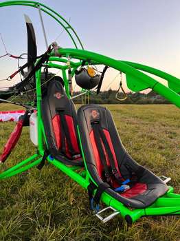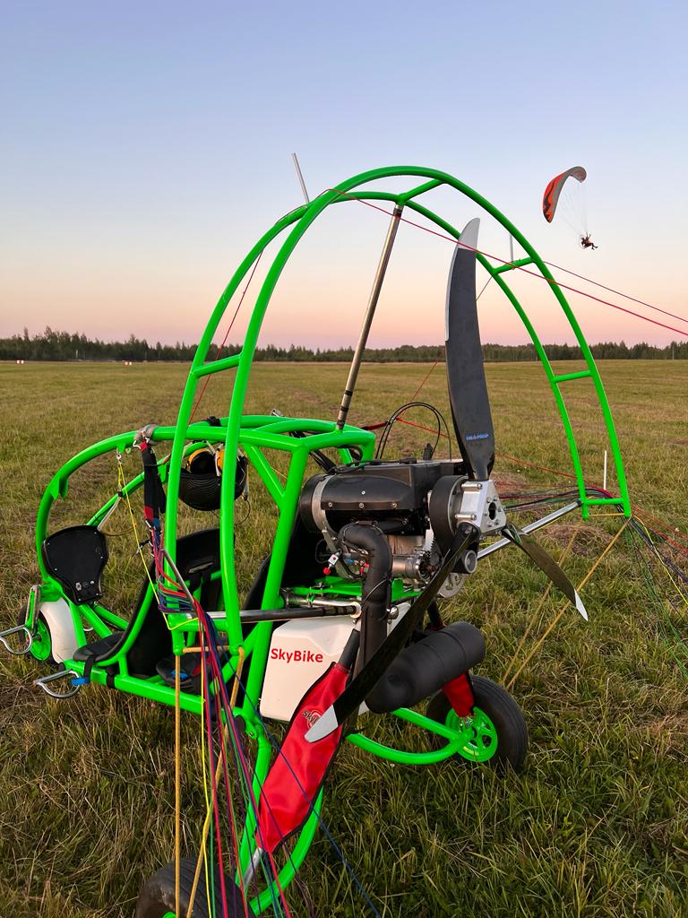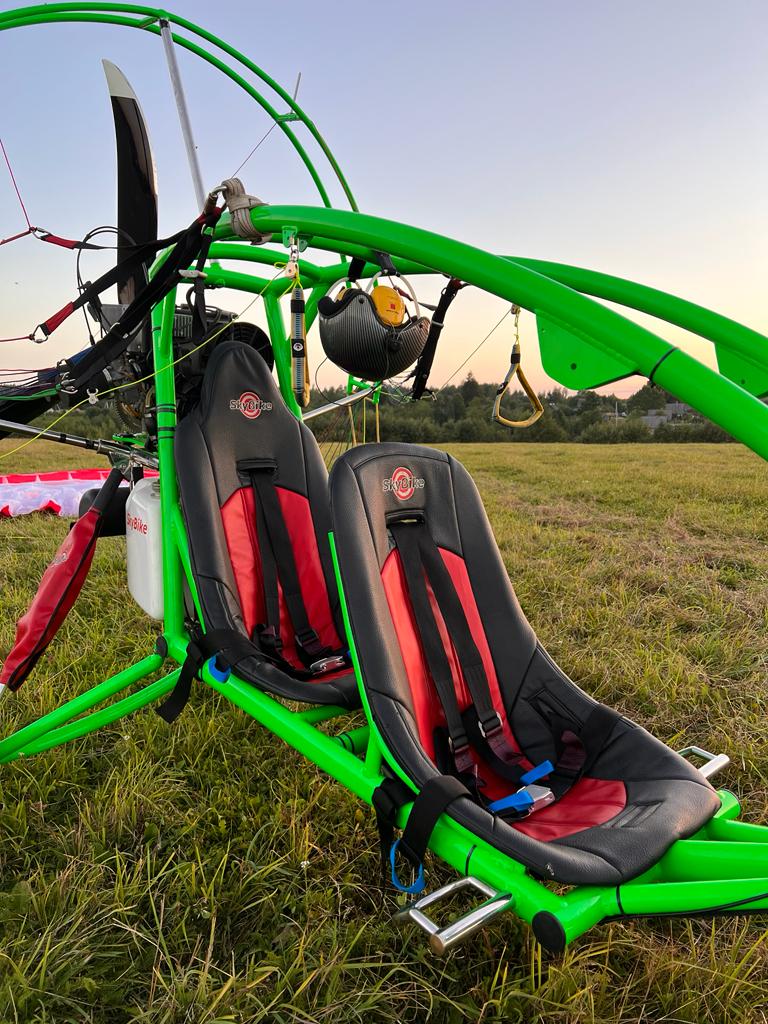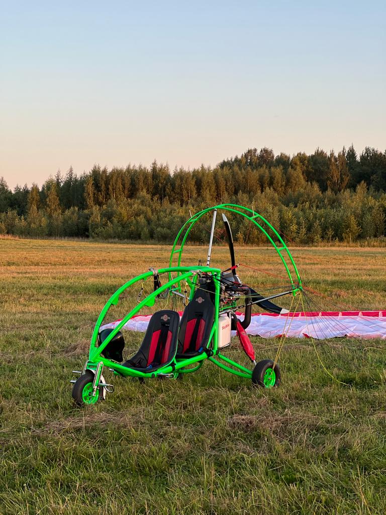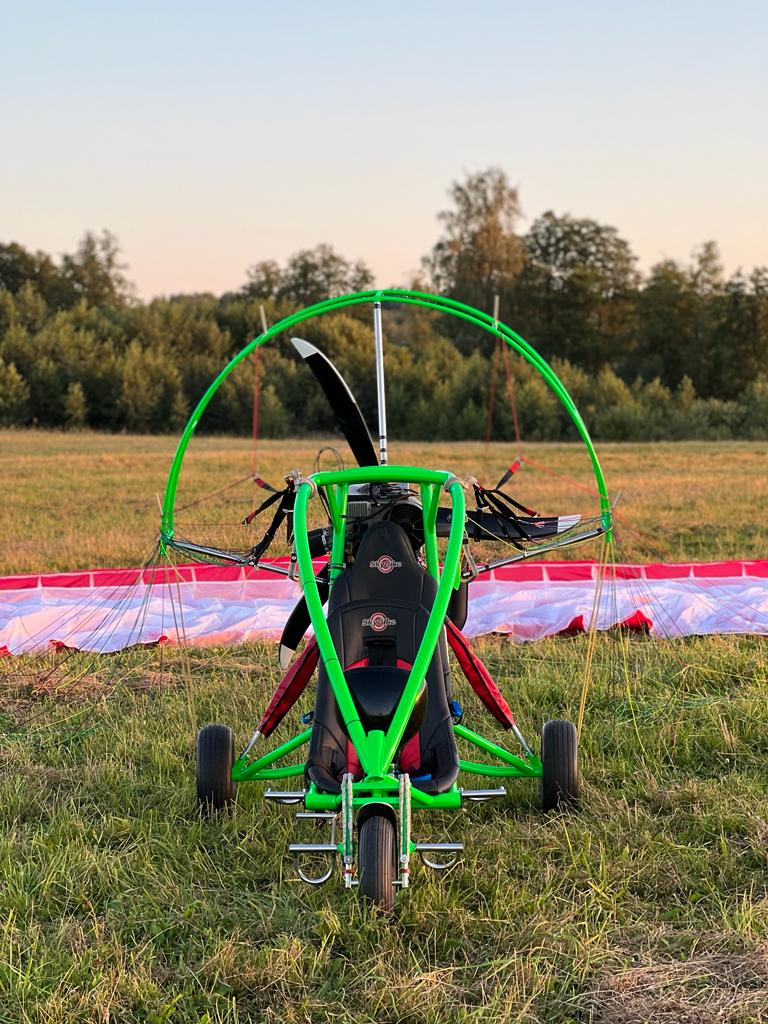 I am selling a large, beautiful tricycle! Rotax-503 engine. Maximum 20 hours of use. Electric starter. Propeller 1600 mm. Thrust 145–150 kg. Suitable for flying with a heavy pilot and passenger. Aluminum frame. The entire tricycle weighs 106 to 120 kg. Depending on the wheels, the ones we have now are heavy! High safety for the pilot and passenger! As with a buggy, the head is protected by a cage. All three wheels have shock absorption. The pilot sits in the front, the passenger in the back. No need to change the suspension point. The fuel tank holds 27 liters. Approximately 3.5 hours of flight. Comfortable seat belts. Comfortable seats. Includes a Dudek Cabrio-42 wing. The wing has 50-60 flight hours. Call if you have any questions.