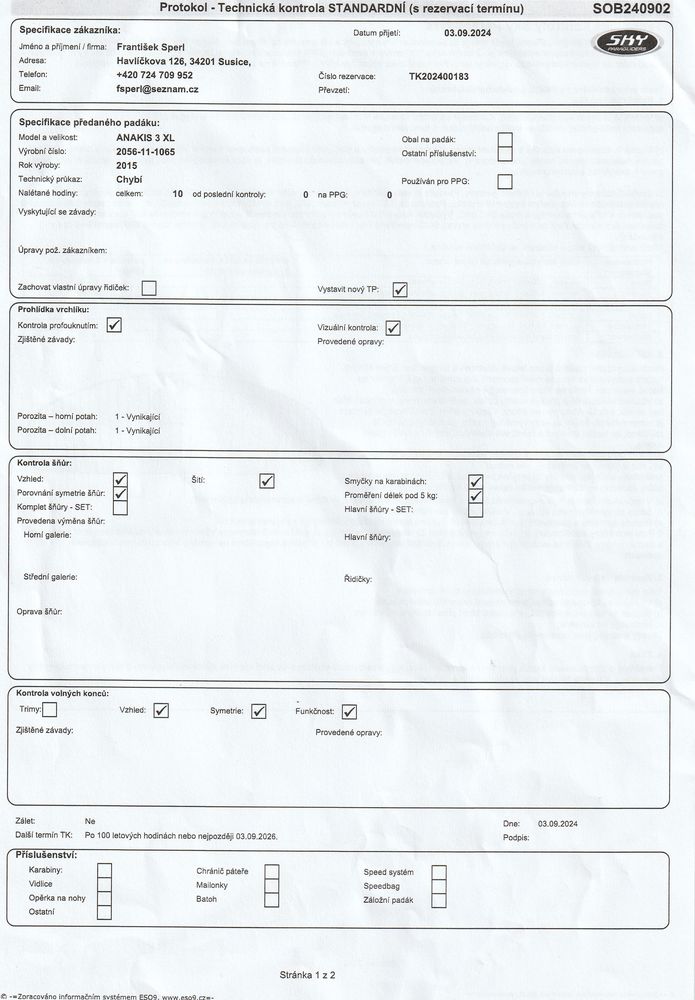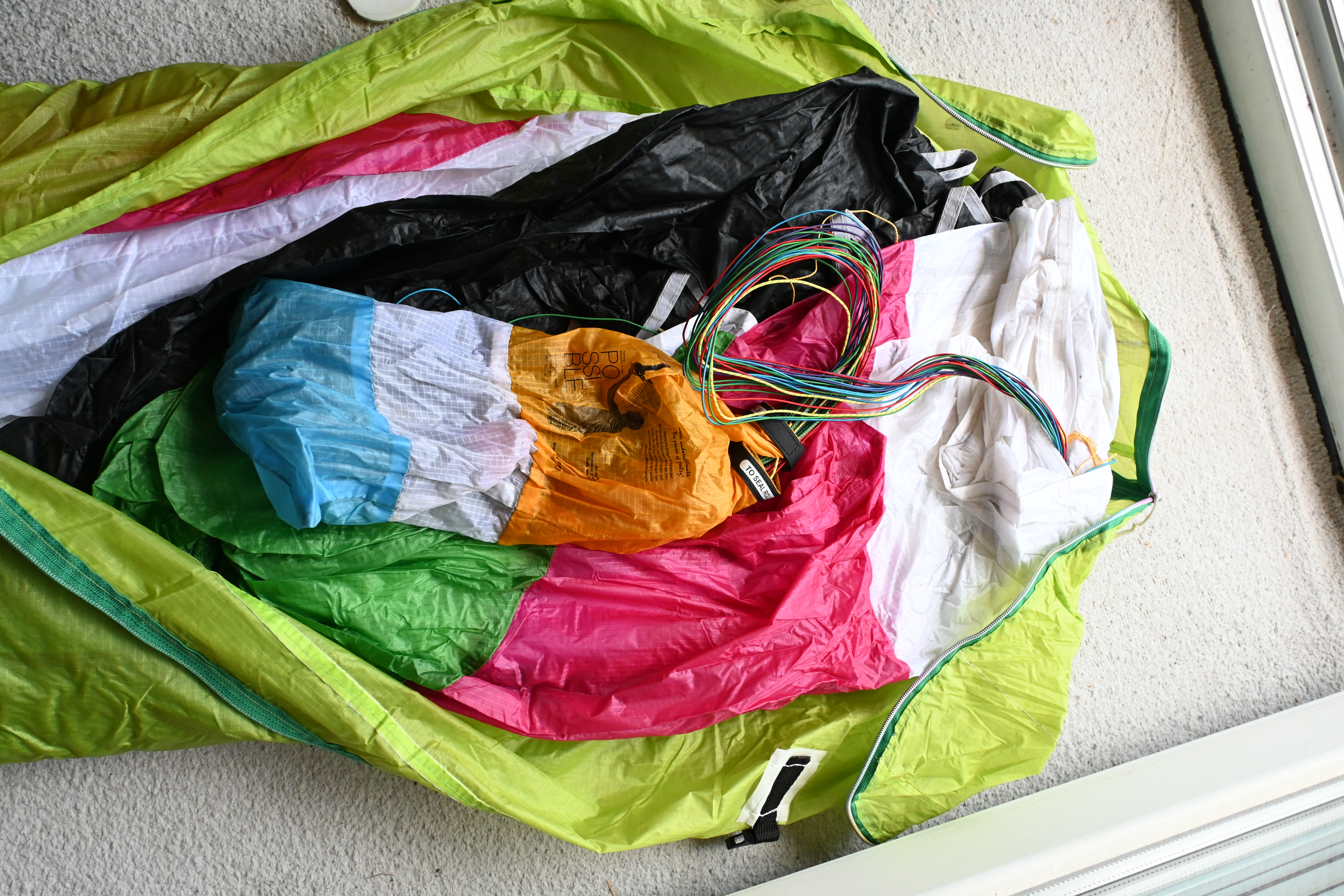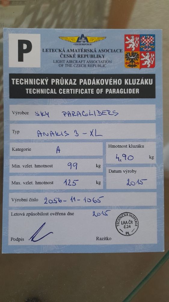 I am offering a wing from SKY, Anakis 3, category A. Size XL, 99-125kg. Technical certificate is valid until September 2026. The wing has flown for about 30 hours in total. Condition like new, no damage. Beautiful, shiny surface. I will add a leaflet cover (light green). The wing is good, agile, controls great. It will support a beginner, it is tolerant of piloting errors.