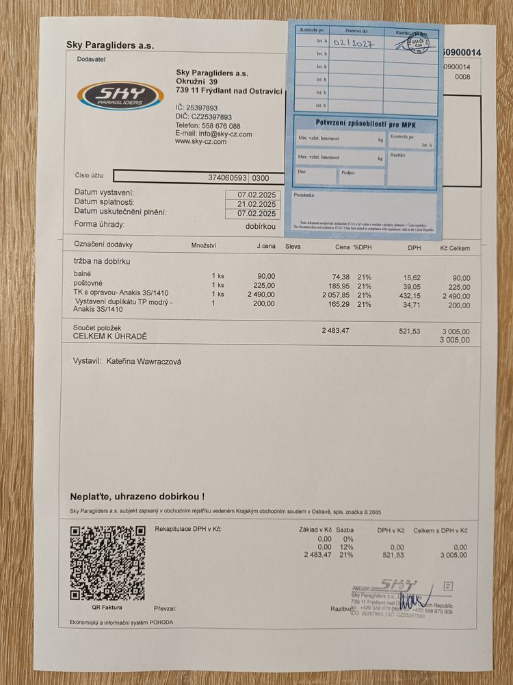 I am selling a SKY ANAKIS 3 COMPLETE - S year 11/2018 64-81 kg. New TK porosity vinikajici, replacement of some lines due to broken braid. see protocol from TK. The parachute is very beautiful, well-preserved and clean. The parachute is suitable for beginner pilots after a course or for occasional recreational pilots. The set includes a well-preserved, sturdy and safe KARPOFLY Mystic2 seat, size M, year 12/2007 Steel carabiners. Relax bar for resting your feet. A reserve parachute is attached to the seat with a mailer. Repackaged, undamaged and clean. EL speedo up to 80kg, year 4/2017 GRADIENT backpack, new and very sturdy - comfortable. I DO NOT RESPOND TO ANY FRAUDULENT OFFERS OF THE TYPE,,, I WILL SEND A COURIER AND THE LIKE!!!