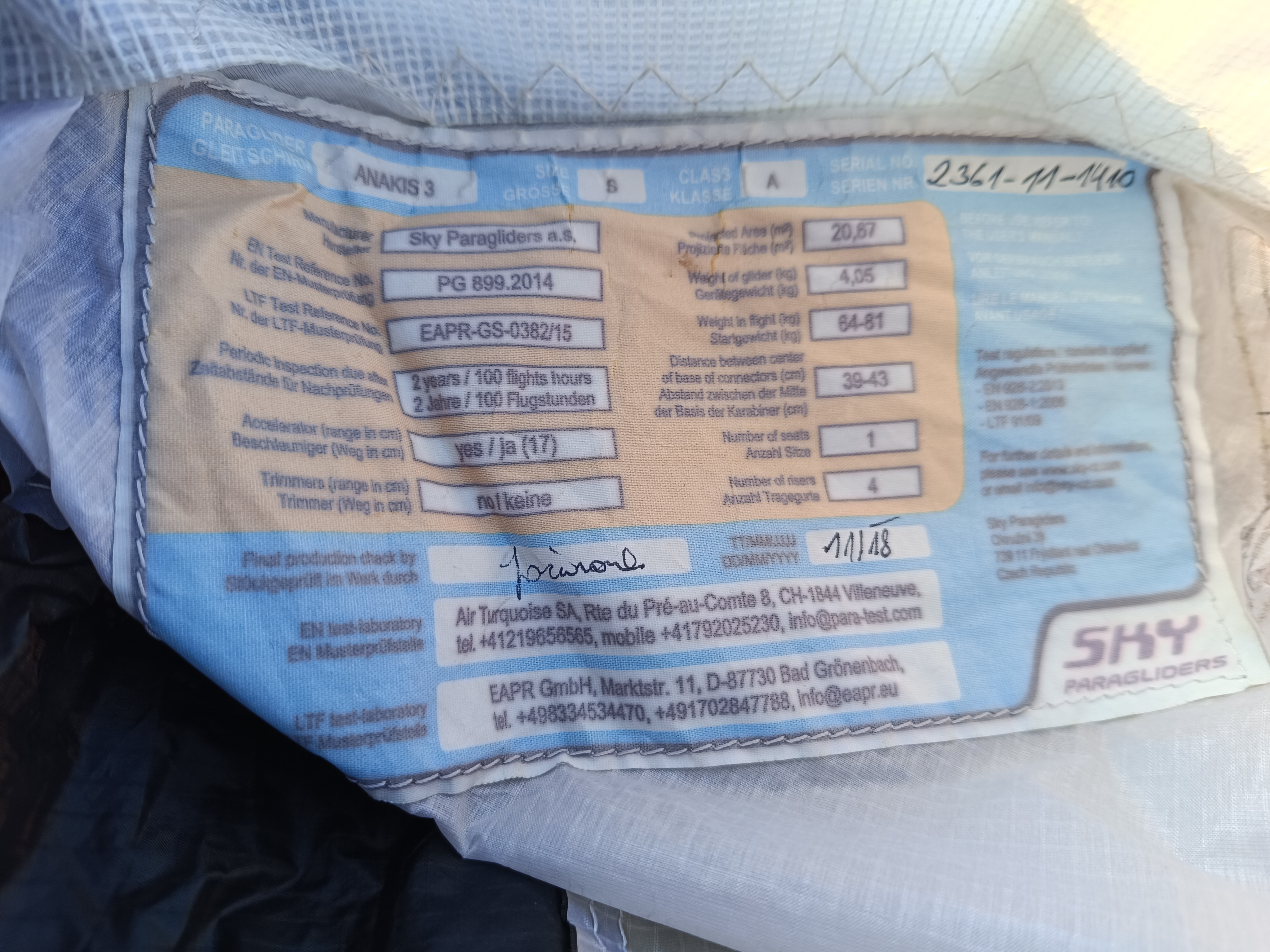 I am selling a SKY ANAKIS 3 COMPLETE - S year 11/2018 64-81 kg. New TK porosity vinikajici, replacement of some lines due to broken braid. see protocol from TK. The parachute is very beautiful, well-preserved and clean. The parachute is suitable for beginner pilots after a course or for occasional recreational pilots. The set includes a well-preserved, sturdy and safe KARPOFLY Mystic2 seat, size M, year 12/2007 Steel carabiners. Relax bar for resting your feet. A reserve parachute is attached to the seat with a mailer. Repackaged, undamaged and clean. EL speedo up to 80kg, year 4/2017 GRADIENT backpack, new and very sturdy - comfortable. I DO NOT RESPOND TO ANY FRAUDULENT OFFERS OF THE TYPE,,, I WILL SEND A COURIER AND THE LIKE!!!