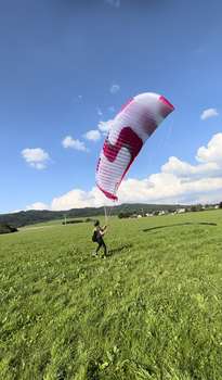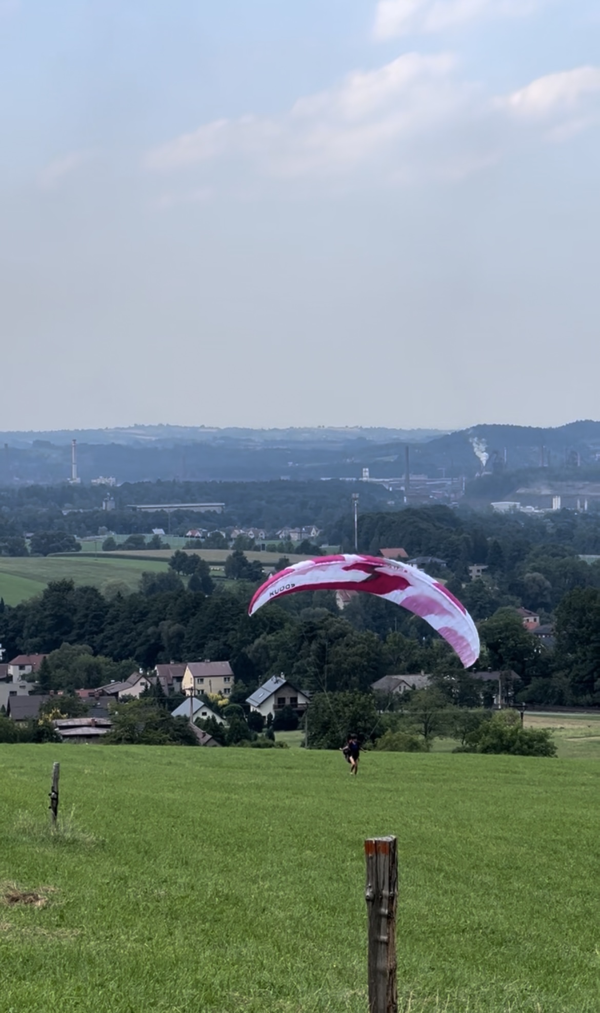 I am selling a SKY Kudos paraglide, size S, including a foil bag. Take-off weight is 64-81 kg. Category low EN B. I bought it from the first owner in the summer of 2023, almost unflown. I flew it for about 20 hours. Sky is pink and white. The wing has always been foiled, it is without patches (it has never been in water, sand or on a tree), the technical inspection is freshly done and valid until 6/2027, it passed with flying colors. There is no problem coming to see the wing and trying it out, a great wing for skilled beginners, or for pilots who want a good and safe wing. I am selling it due to switching to a lower take-off weight. This wing flies best when loaded at the center or at its upper limit.