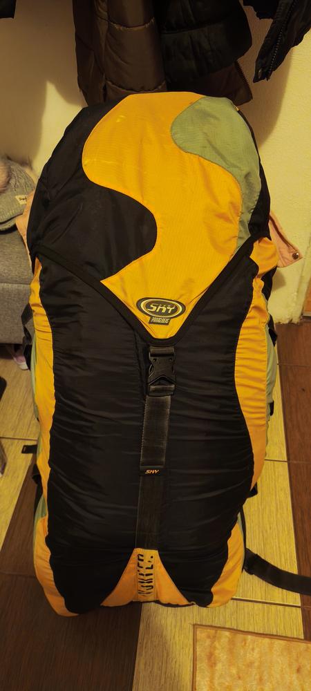 The backpack is big enough for a cocoon seat, wing and helmet. I also carry hiking poles on my side, electronics and a jacket in the pockets. So it can hold all your gear.