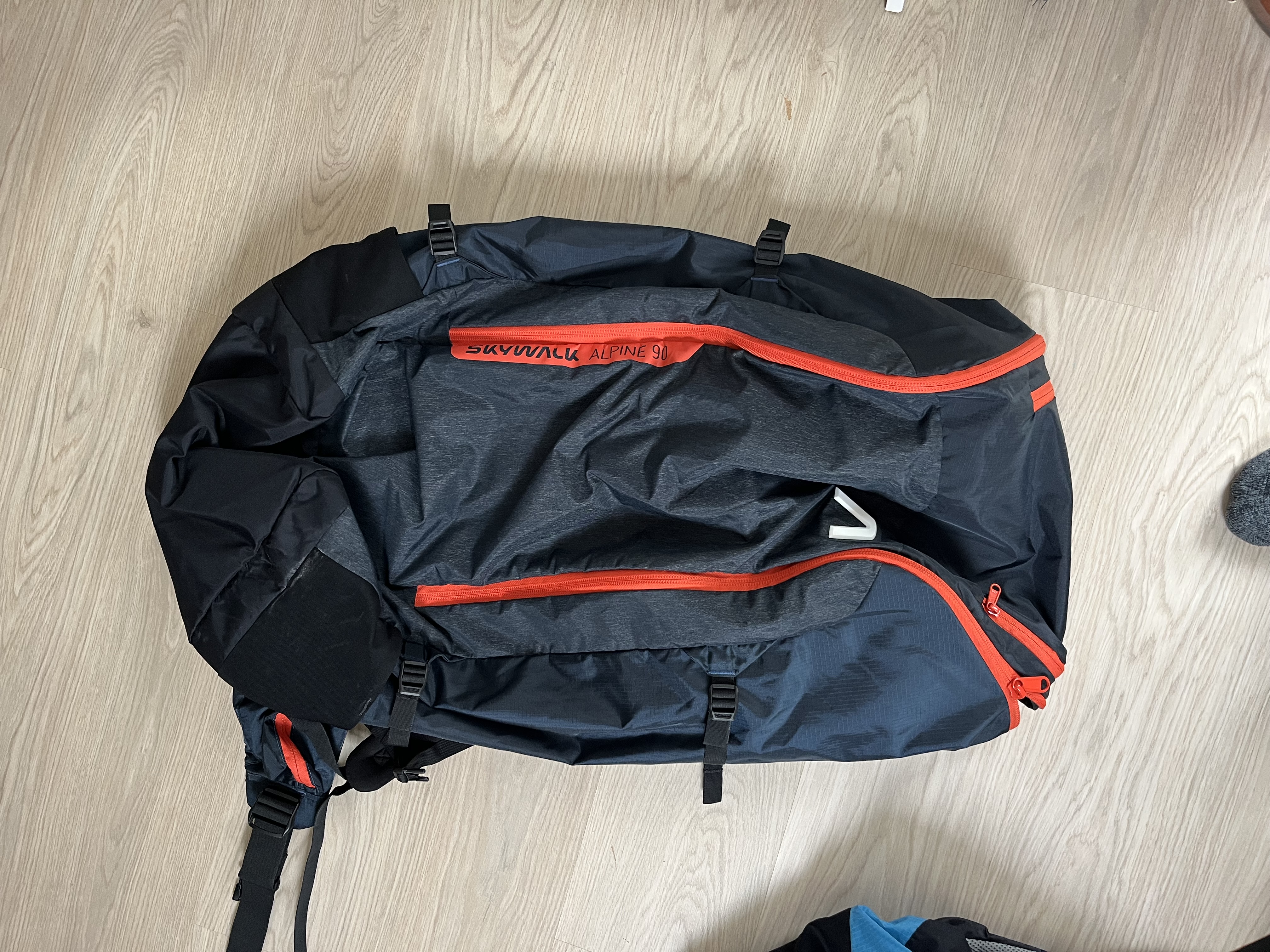 I'm selling a new Skywalk Alpine 90 l backpack. Mesh pockets on the sides, drawstring straps.