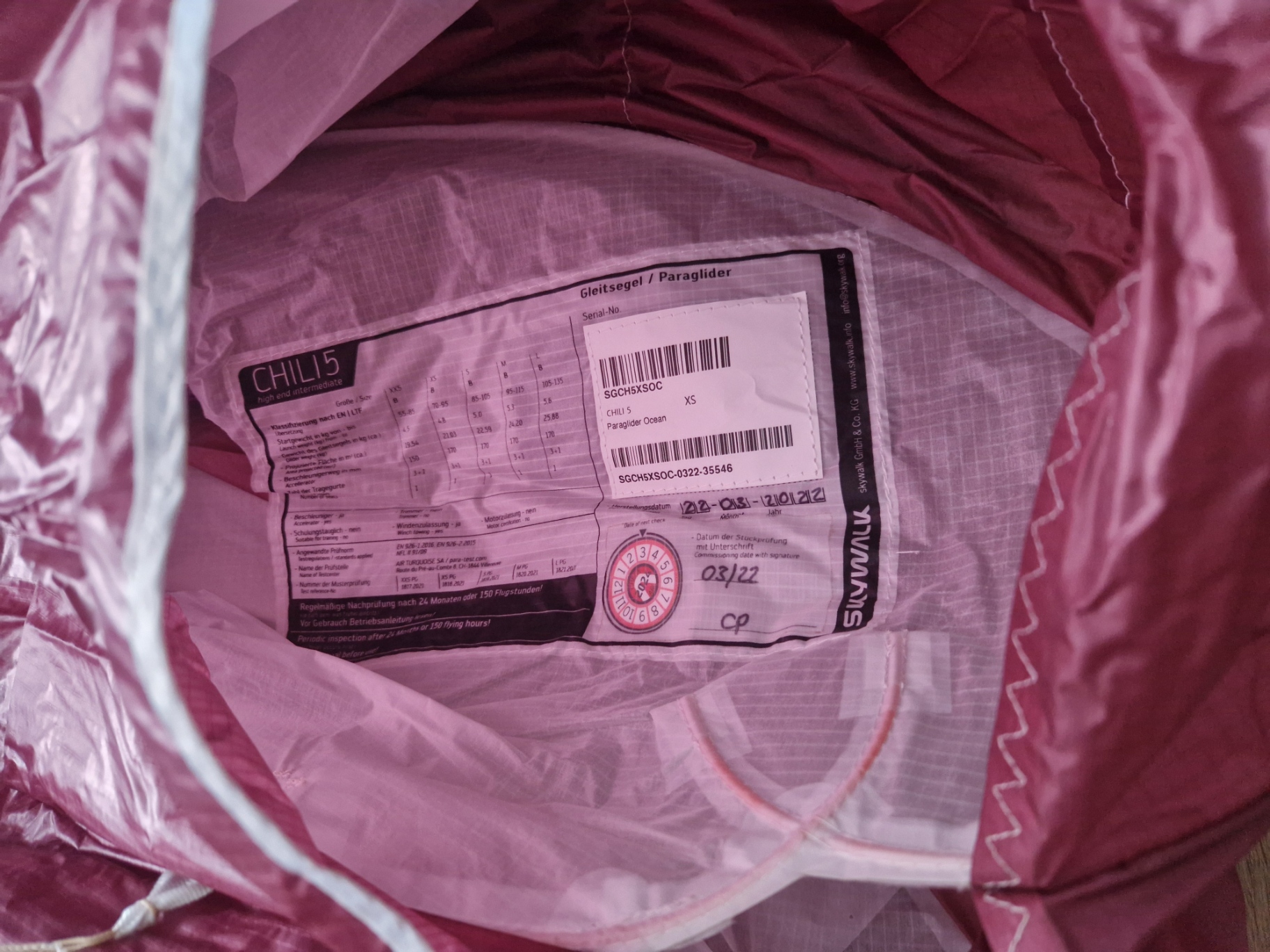 I am selling a Skywal Chili 5 parachute that has been flown for 2 years, no holes, no repairs, in great condition. It has 80 hours of flight time. Stored dry and always well packed. No SIV, there was no water even on the sand. In case of interest, I will add an Advance leaf bag. First owner, bought in 2022. Not flown for the last year and a half (see xContest), weight change + when I go, I only fly H&F