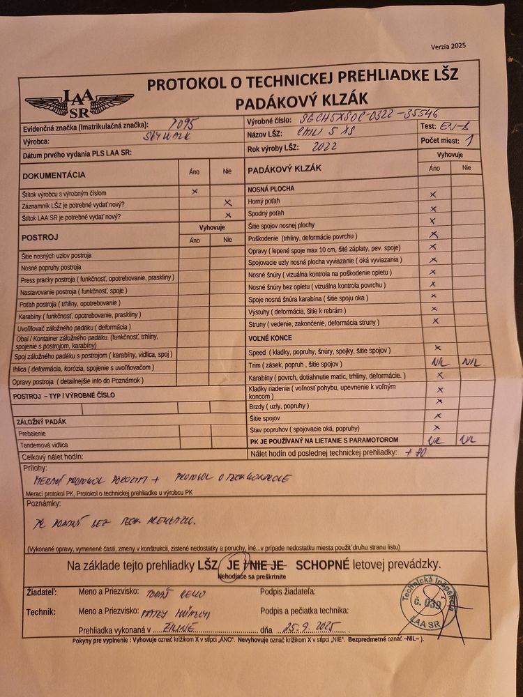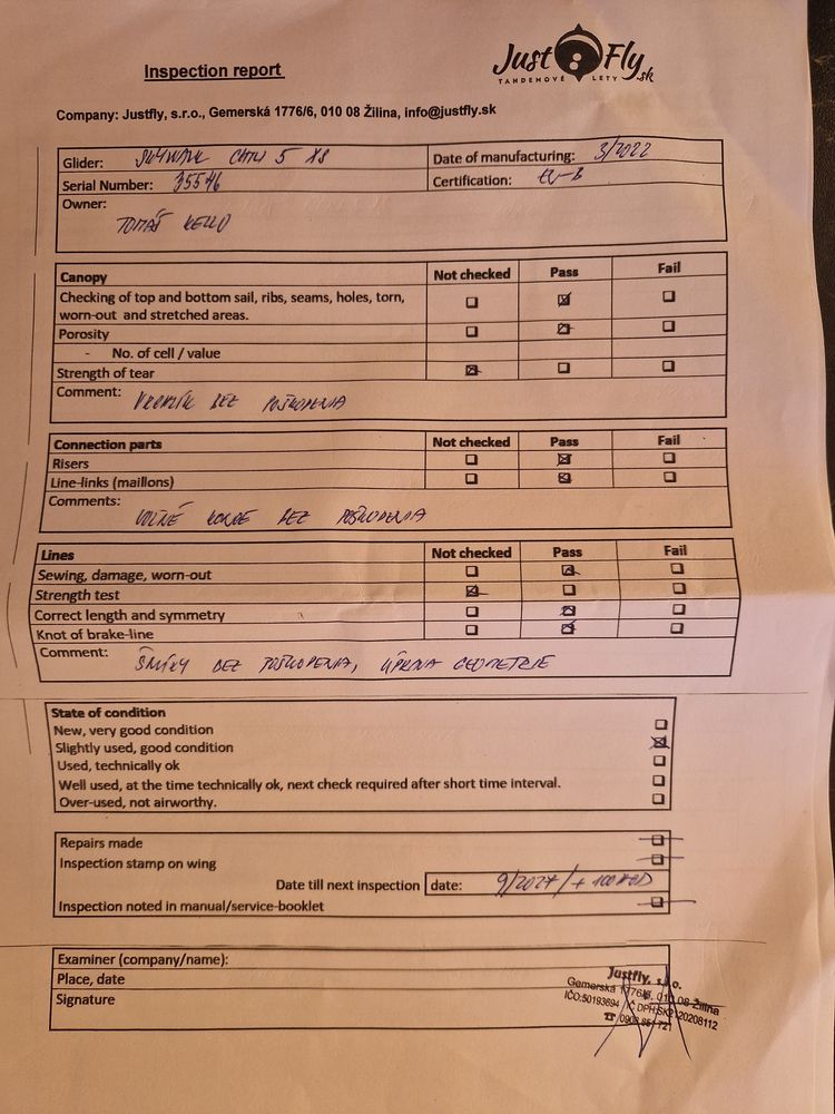 I am selling a Skywal Chili 5 parachute that has been flown for 2 years, no holes, no repairs, in great condition. It has 80 hours of flight time. Stored dry and always well packed. No SIV, there was no water even on the sand. In case of interest, I will add an Advance leaf bag. First owner, bought in 2022. Not flown for the last year and a half (see xContest), weight change + when I go, I only fly H&F