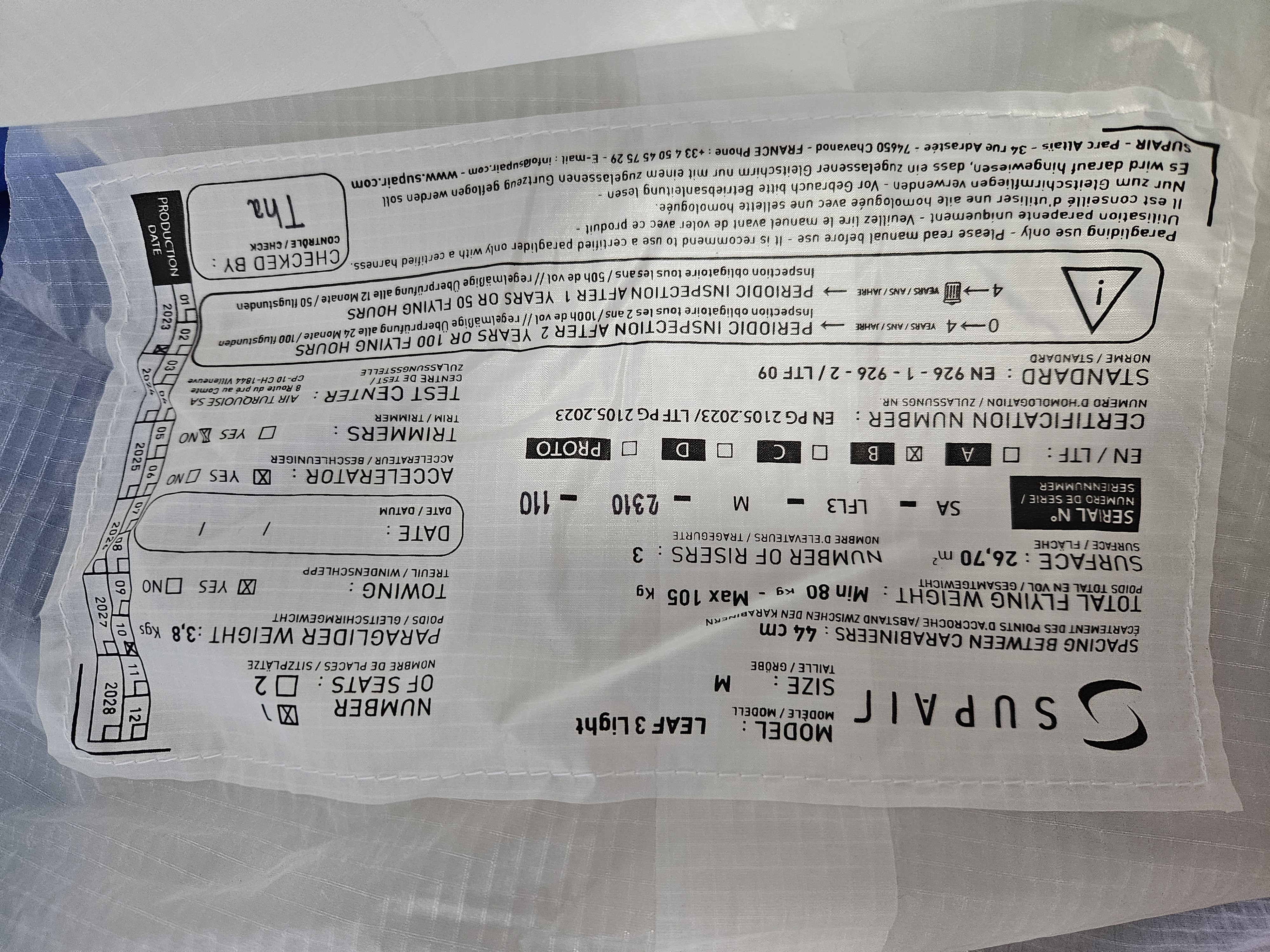 SELL: Wing EN B Supair Leaf 3 Light M 80-105kg No trees Concertinas No water With bag With listing bag TC valid (Part of a Set)
