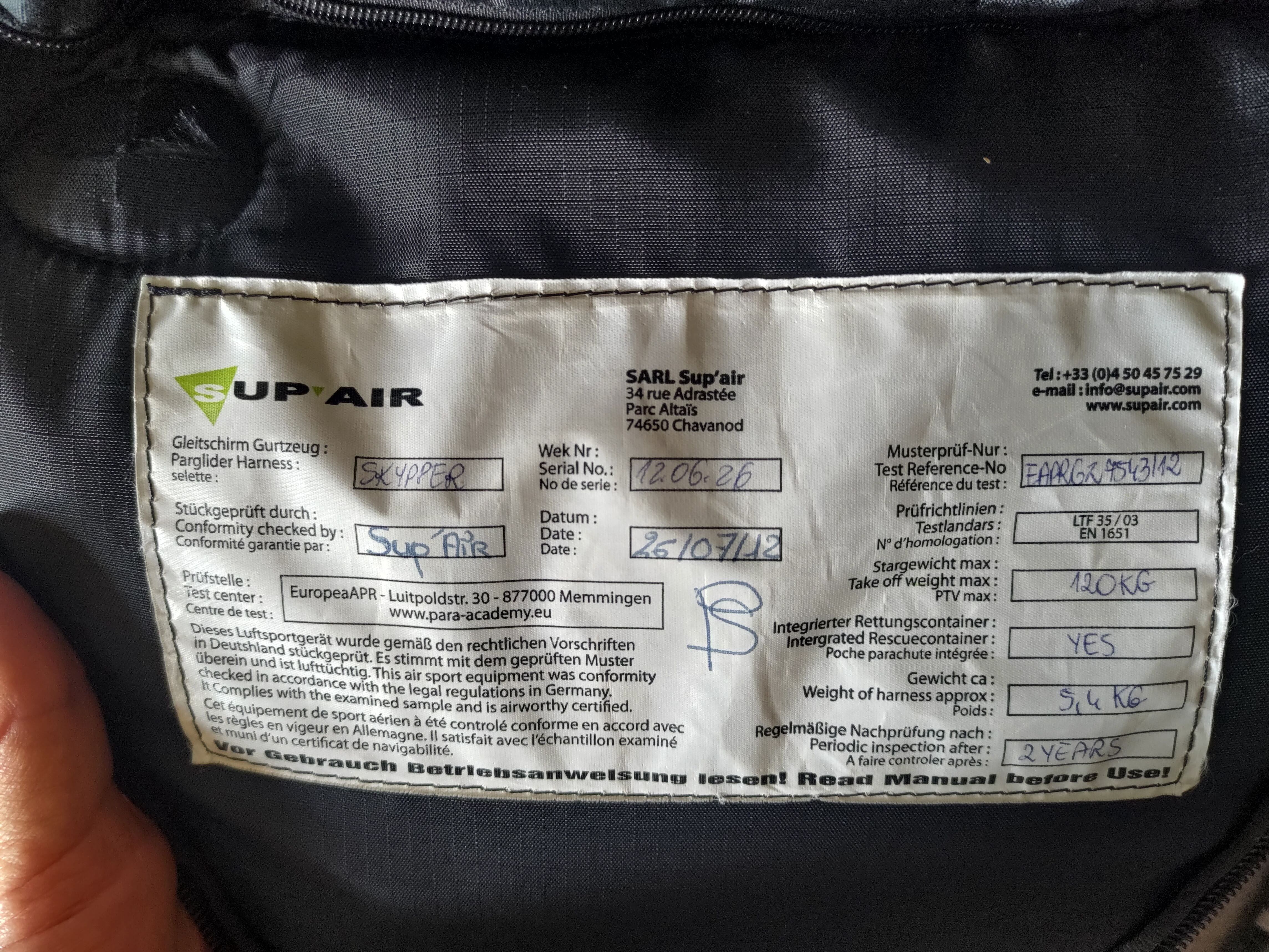 SELL: Harness For Advanced Supair Skypper L Used Reserve from below Carbines Fairing (cocoon) Integrated counter Speed