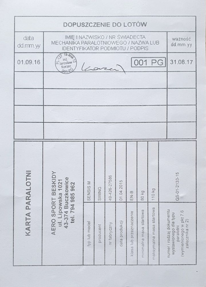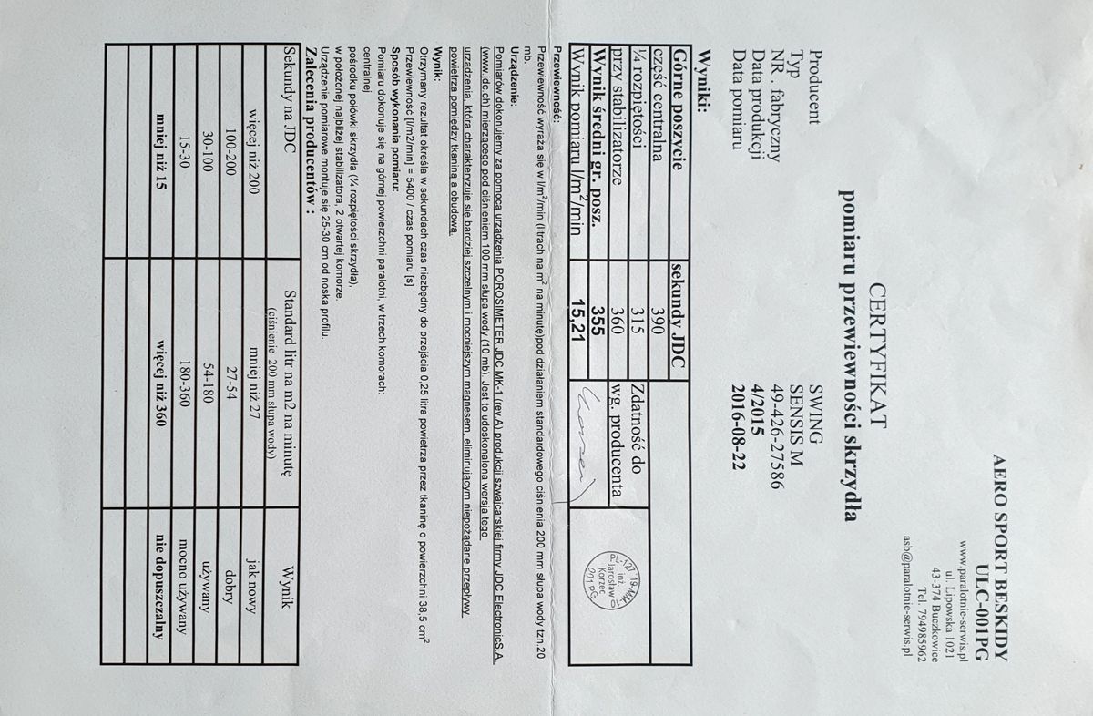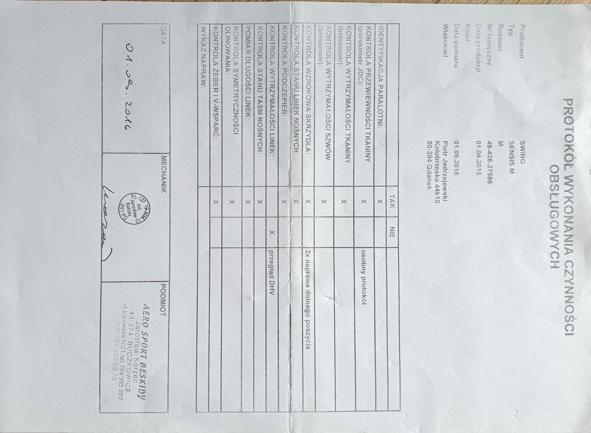 I am selling a used paragliding wing from the renowned manufacturer Swing, model Sensis M, along with a Sky Skylighter II harness and a Swing backpack. Note: The equipment is FULLY FUNCTIONAL, but does not have a current certified technical inspection, because they are issued temporarily and we did not apply for an extension - sold as is. The most important parameters of the wing: Take-off weight: 80-110 kg Minimum speed: 25 km/h Wing area: 24.6 m² Wing weight: 6.6 kg Additional information: DHV safety characteristics: https://service.dhv.de/db3/muster/safetyclass/id/-2683?lang=en Wing instructions: https://www.swing.de/tl_files/content/produkte/gleitschirme/sensis/sensis/downloads/SWING_SENSIS_-_Manual.pdf The wing has been produced since 2015, and we bought it in 2016. It was used sporadically - we live in Gdańsk, where it is difficult to find conditions for flying, and trips to the mountains happened at most once a year for a few days. The equipment was last used in 2020. Since then, it has been stored in a dry, warm place. In the set, I am selling a light and comfortable Sky Skylighter II harness (link to specifications: https://sky-cz.com/skylighter-2), ideal for a person 173 cm tall and weighing 90 kg - according to the owner, the equipment was just right for him. The whole thing fits in a company Swing backpack, which is in good condition, without damage - convenient for carrying a paraglider, harness, helmet and a change of clothes. Technical condition: The equipment is in good technical and visual condition - the lines, fasteners and material do not show any visible damage. It was regularly maintained by the owner, and all minor repairs were carried out on an ongoing basis. At the moment, no repairs are necessary. The wing HAD regular certified INSPECTIONS performed while it was used. I prefer personal collection in Gdańsk - the buyer can personally assess the condition of the equipment before purchasing. Shipping is possible for an additional fee. I have more photos and videos showing the condition of the glider - I can send them on request. I will answer all technical questions. Feel free to contact me! :)