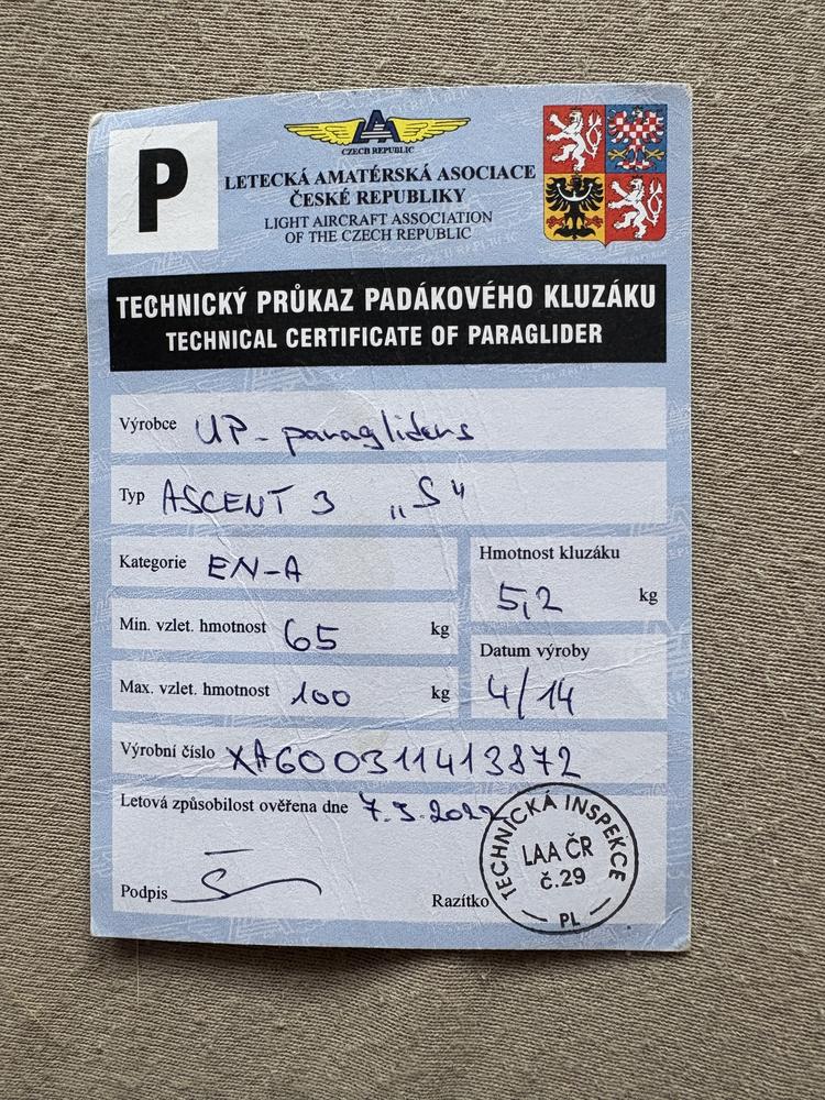Prodám paraglidingový komplet. Křídlo EN-A UP Ascent 3 + reversní sedačka Advance Progress 3 (vel. M).