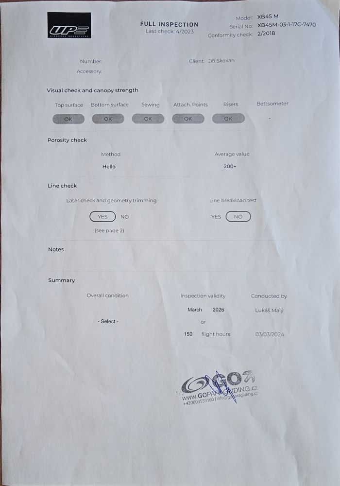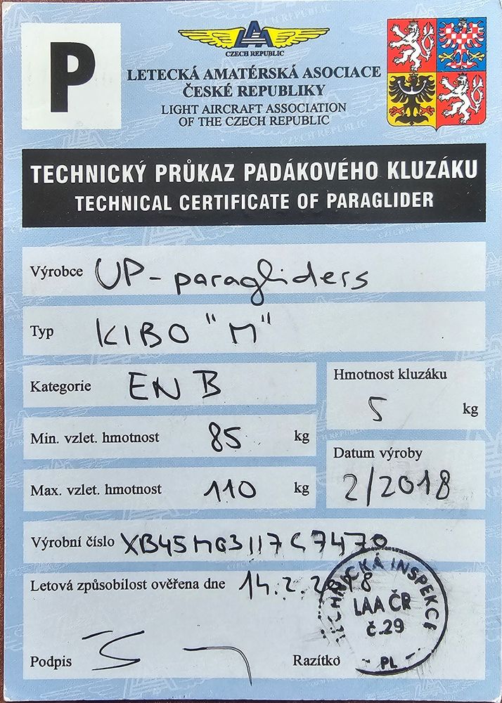 Hello pilots. I'm selling my Kibo, which has been a great ride for me. It's a mid B. It's beautifully controllable, precisely responsive and very playful. I bought it in '23. In the spring of '24, technical and replacement of lines and a tiny patch after a crash into a house. After that, about 19 hours of flying on various terrains. In total, about 31 hours of flying since '23. I switched to a high B and so I want the wing to still fly and not lie idle. The price includes a Gradient bag and a nice and light backpack from Sky. You can try it out by prior arrangement. Complete flights at Xcontest https://www.xcontest.org/world/en/pilots/detail:SkokyTP. I look forward to your interest. Jirka