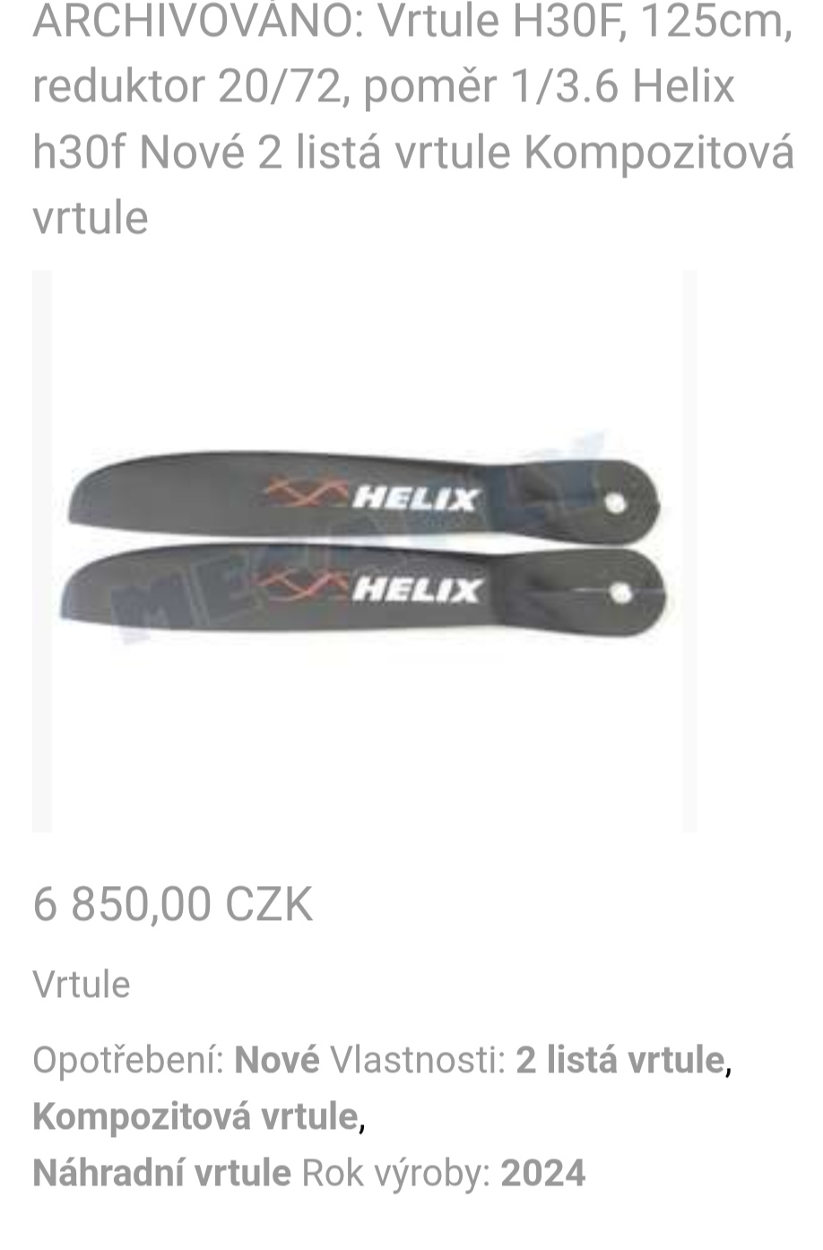 Sprzedam dwułopatowe śmigło kompozytowe Helix H30F do Miniplane Top 80, reduktor 20/72, przełożenie 1/3,6. Cztery otwory. Śmigło jest nowe, nigdy nieużywane, miałem je jako zapasowe. Cena 6850 CZK. Wysyłam pocztą za pobraniem, tylko do Czech i Słowacji.